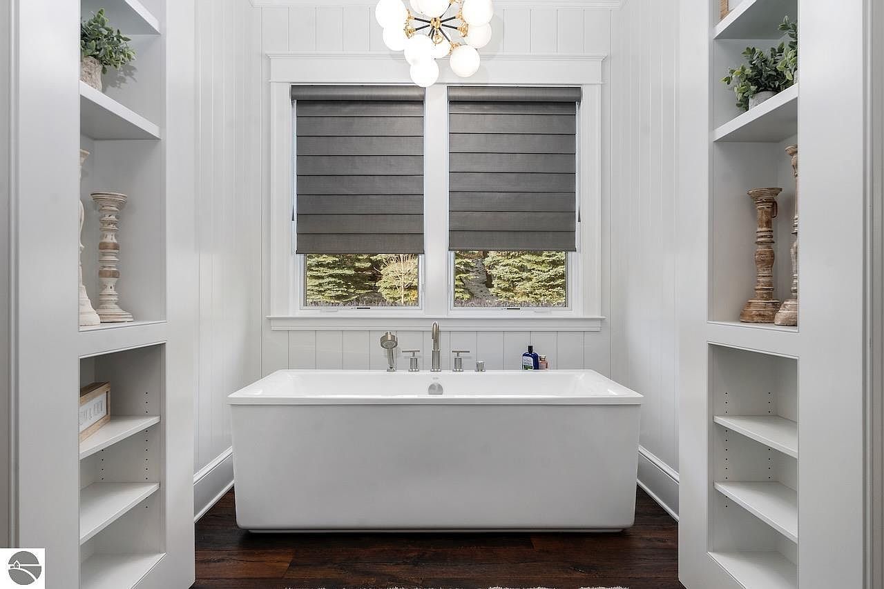 This serene bathroom section features a modern, freestanding rectangular bathtub positioned centrally against a wall with twin windows. The windows are fitted with sleek gray Roman shades, which contrast softly against the white shiplap walls and trim. Flanking the tub are built-in white shelving units, showcasing decorative wooden candlesticks and greenery that introduce a natural and rustic charm to the otherwise minimalist space. The dark wooden flooring adds warmth and richness, balancing the crisp white elements, while a contemporary globe chandelier overhead finishes the look with elegant sophistication.