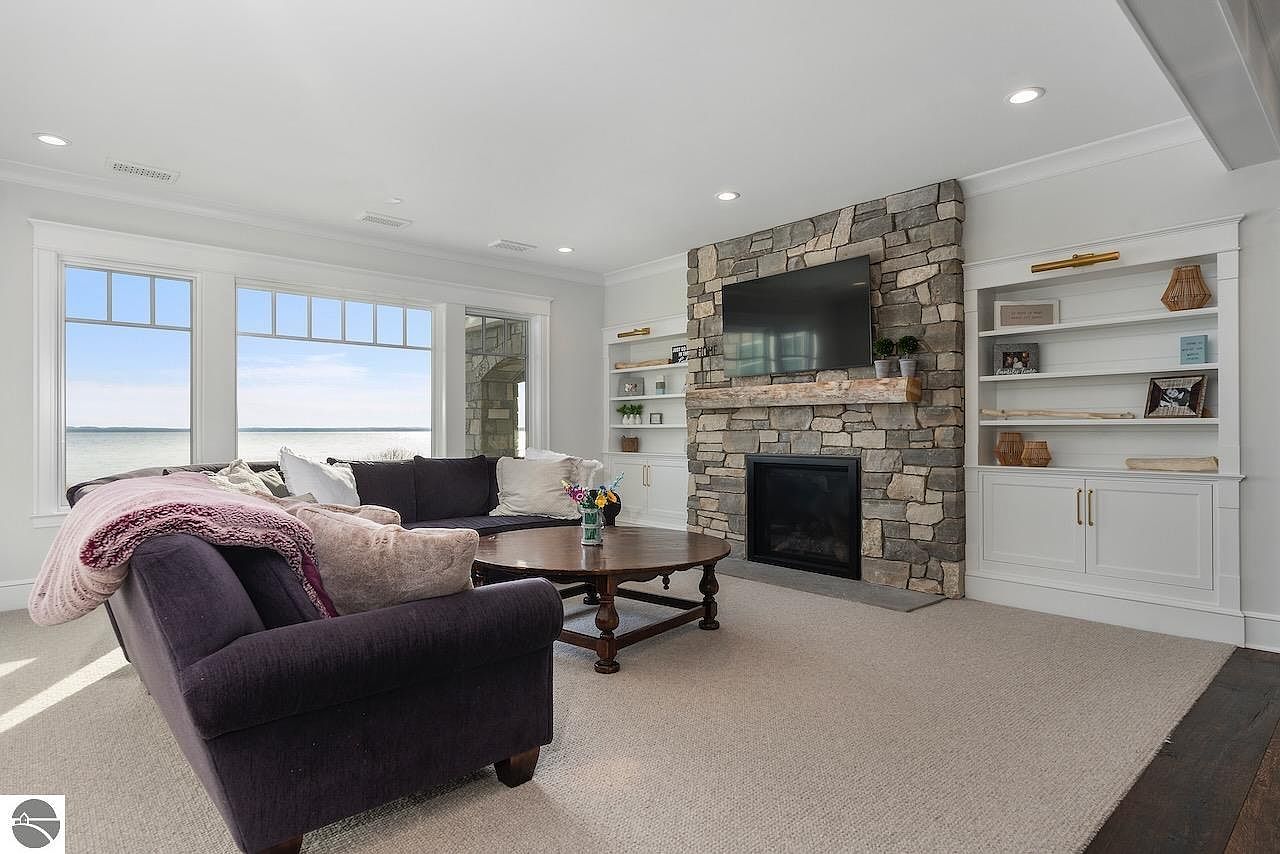 This cozy living area centers around a rustic stone fireplace topped with a natural wood mantel, above which a flat-screen TV is mounted for entertainment. Flanking the fireplace are built-in white shelves and cabinets, accessorized with minimalist decor accents and warm lighting. Plush, dark upholstered seating with soft, neutral-toned pillows and a throw blanket invite relaxation. A round wooden coffee table balances the softness of the carpeted flooring, complementing the room’s neutral palette. Large windows flood the space with natural light while offering serene water views, enhancing the calm and welcoming atmosphere.