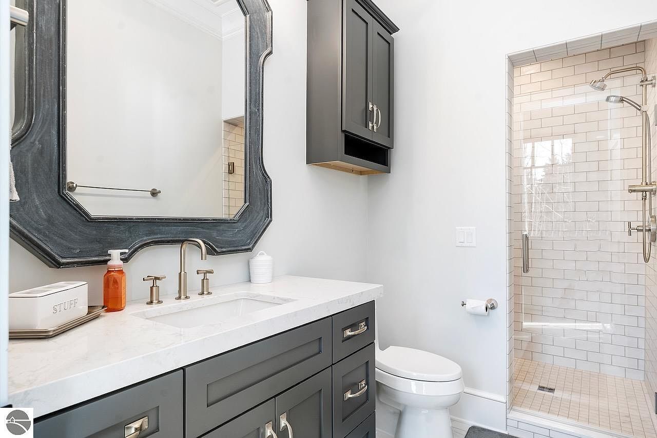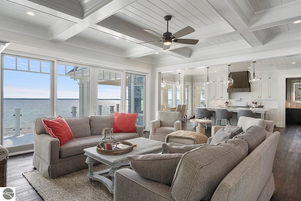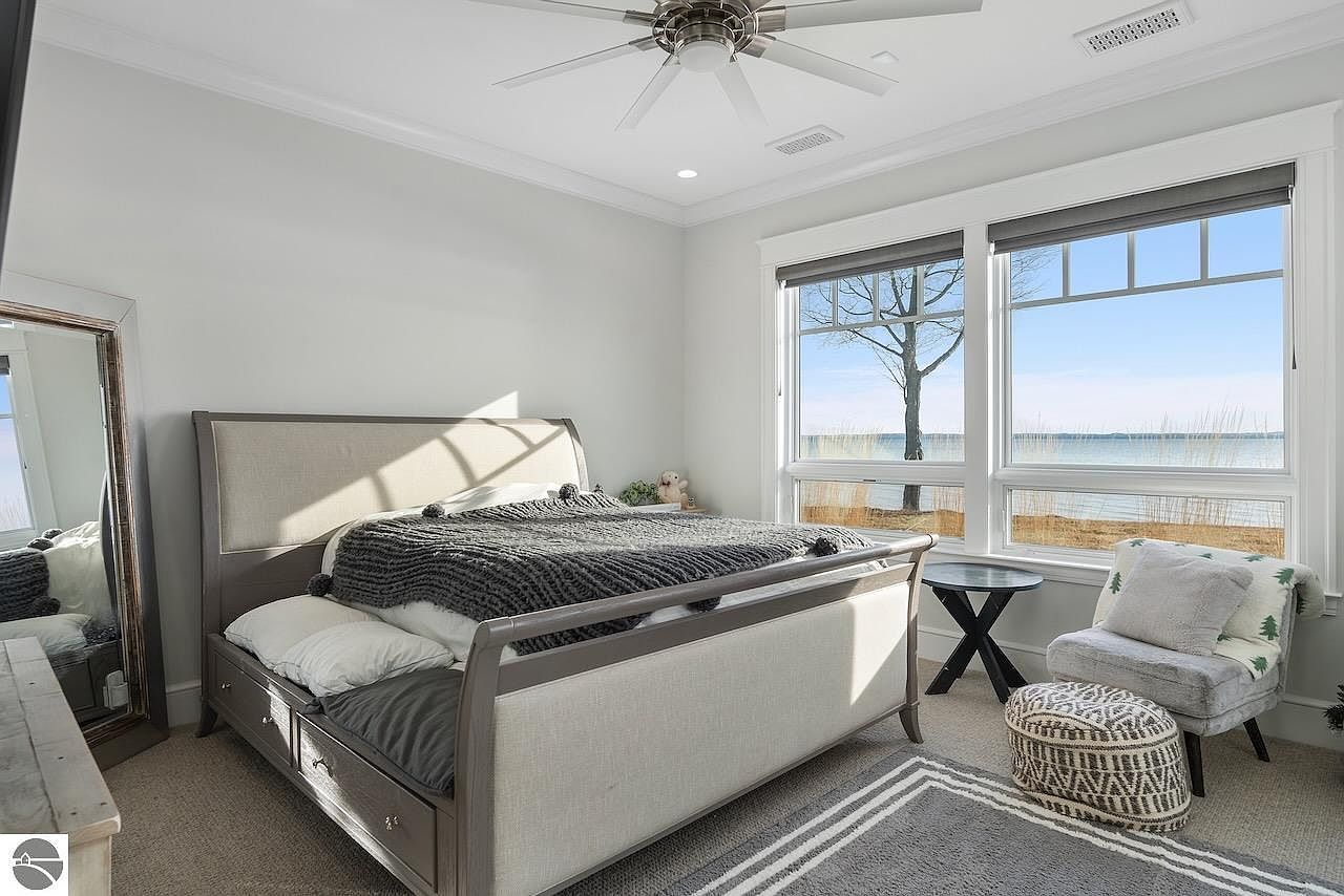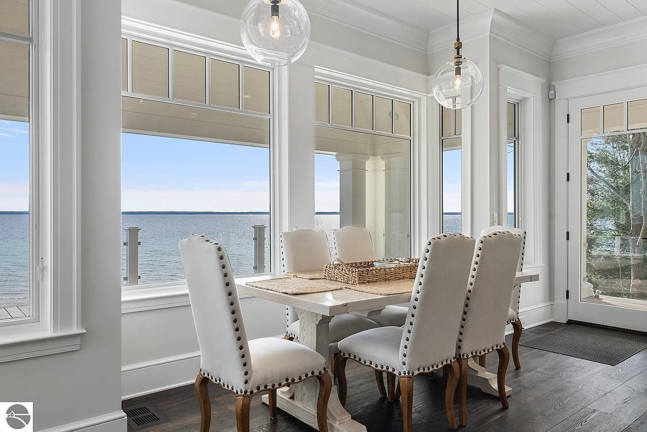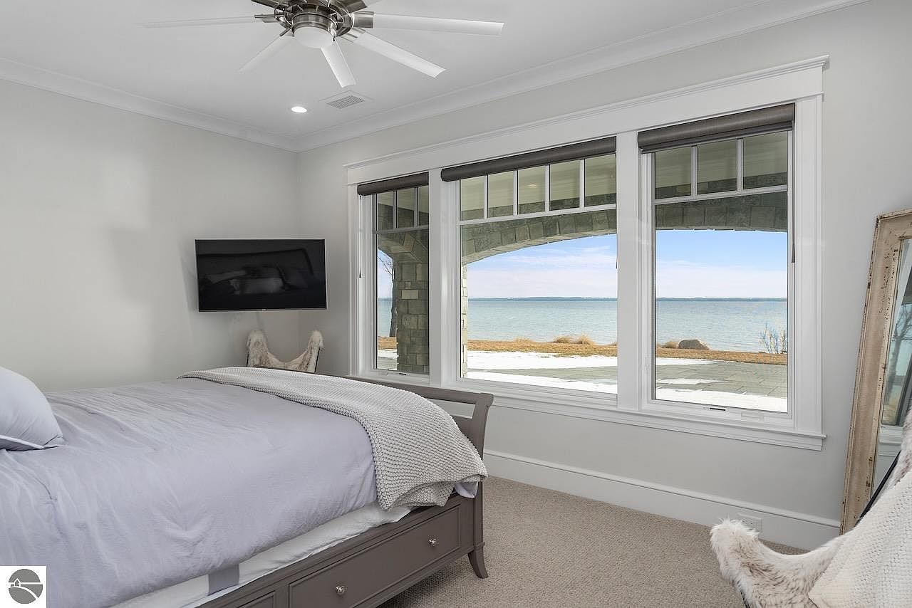 This exquisite home located on the scenic Old Mission Peninsula in Traverse City, Michigan, perfectly exemplifies luxury lakefront living. Spanning an impressive 10,400 square feet, this residence sits on approximately 178 feet of prime sandy frontage along Lake Michigan. Designed by the esteemed architects White & Liebler, the home combines classic and modern architectural elements that create an elegant yet warm ambiance. The exterior showcases a sophisticated blend of stone and classic shingle siding with large, multi-paned windows that offer breathtaking views of the lake from nearly every room. Offered at $8,875,000, this magnificent lakefront estate provides all the amenities and comforts to start making unforgettable memories in one of Michigan’s most coveted waterfront locations.