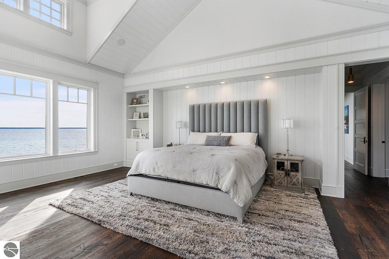 This master bedroom exudes a serene coastal charm with its vaulted ceiling and white shiplap walls that enhance the airy feel. Floor-to-ceiling windows reveal stunning water views, allowing natural light to flood the space. The focal point is a plush gray upholstered bed with a vertically tufted headboard, flanked by matching bedside lamps on rustic wooden nightstands. The large, textured area rug anchors the space and contrasts beautifully with the rich dark hardwood floors. Built-in shelves beside the bed hold personal touches, completing the room’s blend of comfort, sophistication, and nature-inspired tranquility.