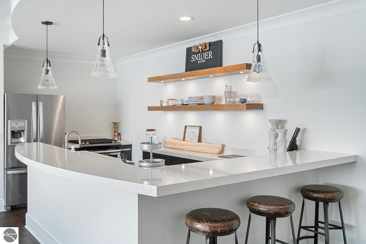This kitchen features a sleek breakfast bar with a white quartz countertop extending in an L-shape, providing ample space for casual dining or food prep. Three rustic leather cushioned stools with black metal legs add a warm, vintage touch against the modern white surfaces. Above the counter, two pendant lights with textured glass shades offer soft, atmospheric lighting. The back wall is minimalistic with two floating wooden shelves accented by built-in spotlights, showcasing simple ceramics and glassware. Stainless steel appliances and dark cabinetry beneath the counter add depth to the otherwise bright, clean color palette.