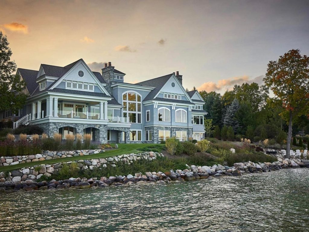 This stunning waterfront home blends classic and modern architecture with a spacious layout that overlooks the serene water. The exterior features a mix of soft blue siding and substantial stonework along the foundation and chimneys, creating a balanced, timeless look. Large white-trimmed windows dominate the façade, allowing natural light to flood the interior. The roof incorporates multiple steep gables with dormer windows and a cupola, adding architectural interest. A broad porch wraps a side section, enhancing outdoor living. Natural landscaping with stone retaining walls and a gentle slope to the water completes this picturesque lakeside retreat.