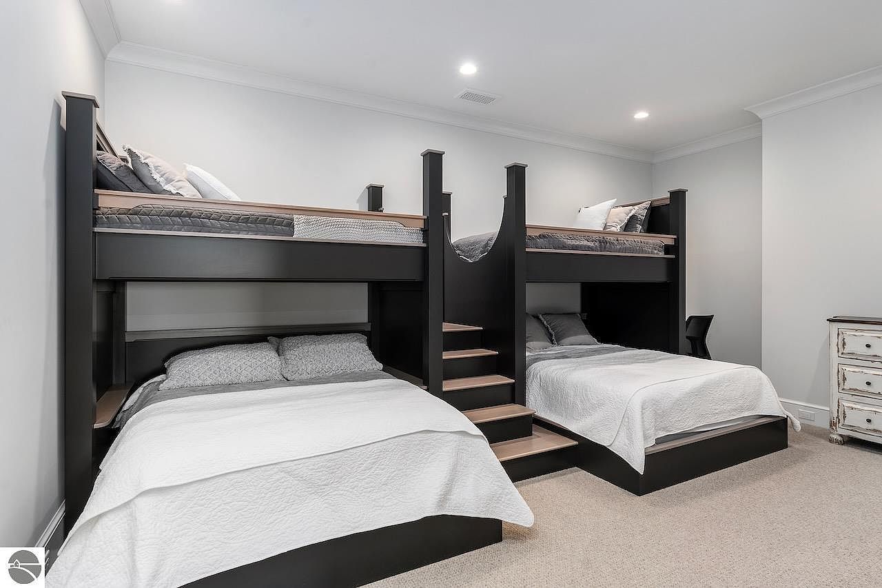 This bedroom features a functional and modern design with a custom built-in bunk bed setup that accommodates four sleepers comfortably. The black wooden frame creates a strong architectural focal point, framing two full-sized beds on the bottom and two twin-size beds elevated above. A central staircase with wood steps provides easy access to the upper bunks. The walls are painted in soft, neutral tones to enhance brightness alongside the recessed ceiling lights. The bedding in light gray and white tones adds a crisp, clean feel, while a distressed white dresser on the side offers subtle rustic charm.