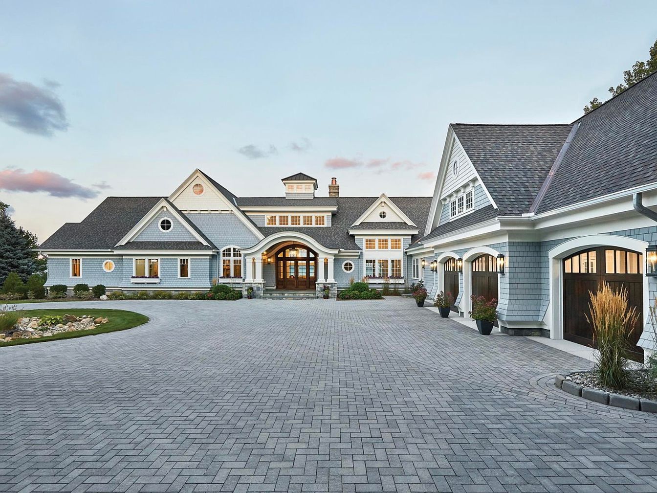 The grand front exterior showcases a spacious paved driveway made from interlocking gray bricks, offering ample parking leading to a three-car garage with elegant wooden doors and arched white trim. The home features a coastal-inspired design with light blue-gray shingle siding, white trim accents, and a mix of circular and rectangular windows that add architectural interest. The large central entrance is highlighted by a sweeping curved portico with classic columns, complemented by multiple gabled roofs and dormer windows that create a balanced and welcoming facade. Manicured landscaping and muted tones emphasize refined yet approachable curb appeal.