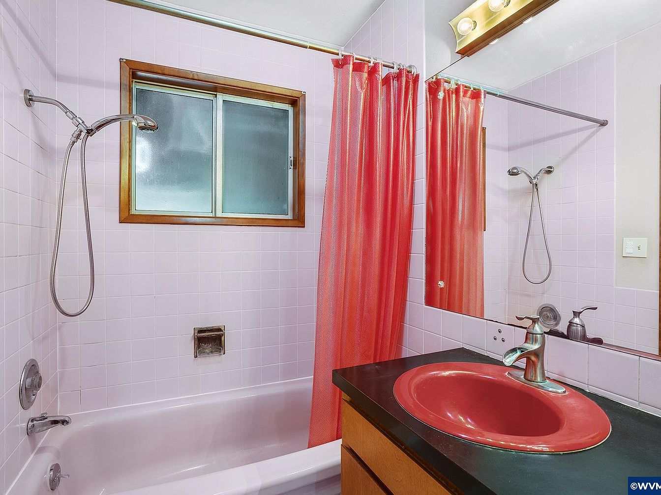 This bathroom features a compact layout with soft pink ceramic tiles covering the walls around the bathtub and vanity area, creating a subtle retro vibe. A frosted glass window framed with natural wood adds privacy while allowing natural light to filter in. The bathtub is classic white, paired with a sleek, modern showerhead on a flexible hose. A red shower curtain adds a bold pop of color, harmonizing with the striking red sink basin set into a black countertop. Below, natural wood cabinets provide storage, contrasting the colorful elements with warmth and simplicity. The mirror extends above the vanity, reflecting light to enhance the room’s brightness. Overall, the bathroom exudes a vintage charm with functional, vibrant accents.