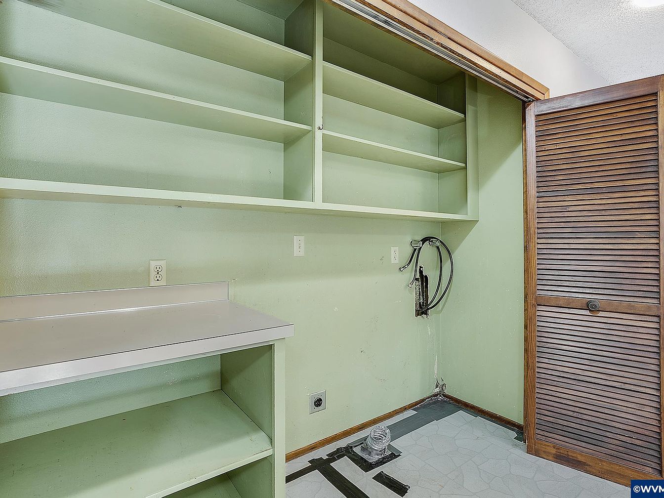 This laundry area features an efficient use of vertical space with built-in shelving painted a muted sage green, matching the walls and creating a cohesive look. The built-in countertop provides a convenient folding or sorting surface, while open shelves offer ample storage for detergents and supplies. The floor shows clear utility connections and tape outlining placement for laundry appliances, hinting at an unfinished or in-progress setup. A wooden bi-fold door with horizontal slats adds a touch of warmth and traditional style, contrasting with the cooler green tones and vinyl tile flooring, represented in light, neutral hues.