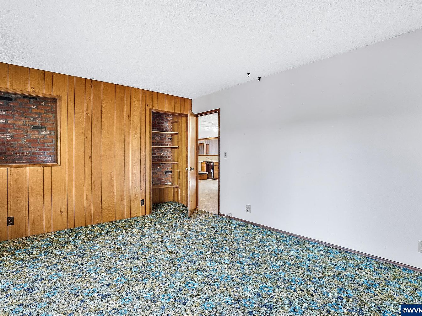 This bedroom features a mix of vintage and natural elements. One wall is clad in medium-toned wood paneling, adding warmth and texture, complemented by inset brick-accented shelves that provide architectural interest and practical storage. The opposite wall is painted in a crisp, soft white, maintaining brightness and balance in the space. The floor is covered with a vibrant, patterned carpet in shades of blue, green, and gray, which contrasts with the neutral walls and adds a playful, retro vibe. The door opens into what appears to be a kitchen or adjoining living area, connecting the spaces fluidly.