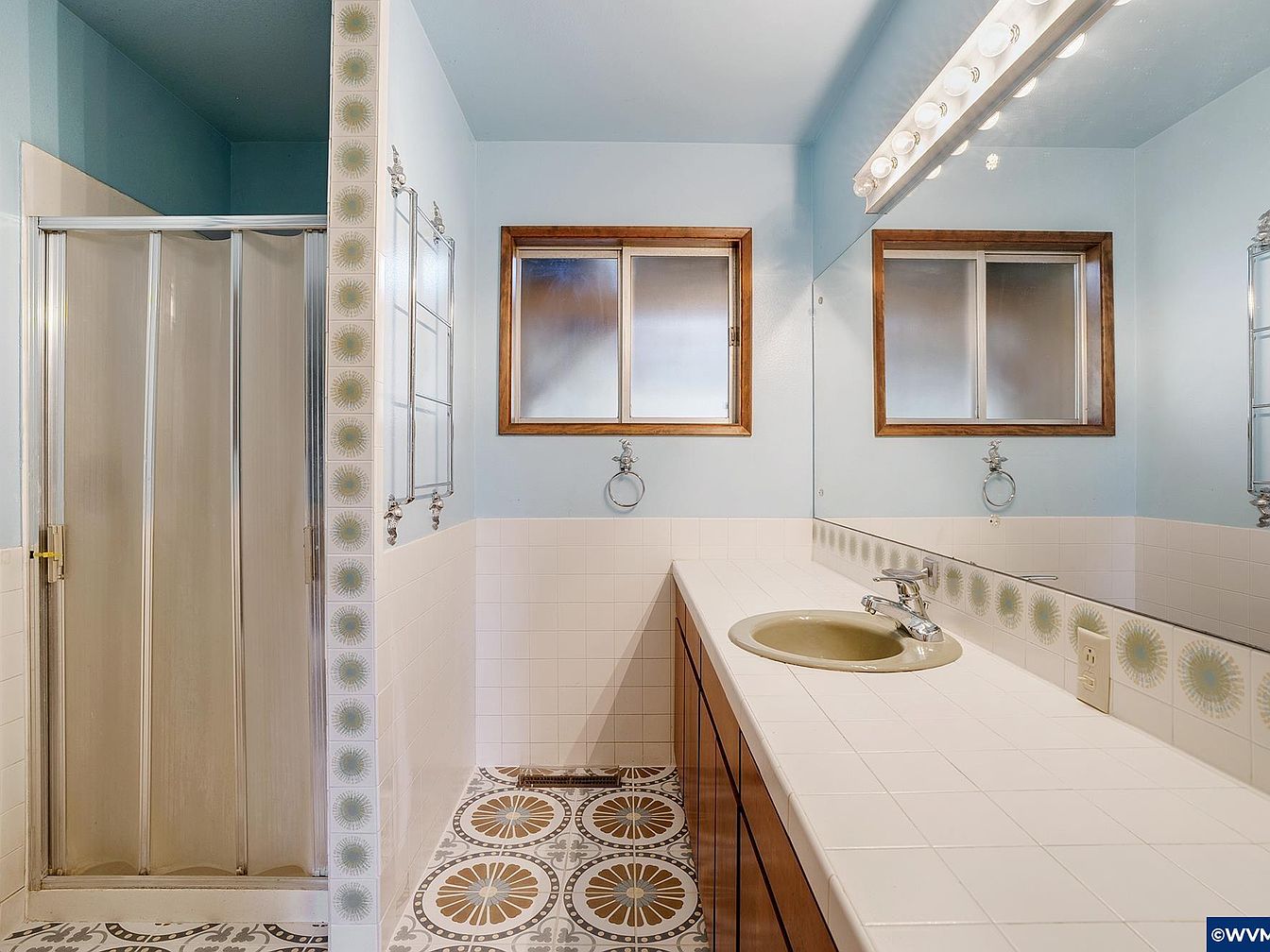 This bathroom area features a linear vanity topped with white tiled countertops and built-in sink in a muted beige tone. A large mirror spans the length of the vanity, reflecting the light from a row of globe bulbs on a fixture above. The walls are painted a soft sky blue above a half-height white tile wainscoting adorned with a decorative round floral tile border. The window trim is finished in natural wood, adding warmth to the space. Adjacent is a shower enclosed with a frosted sliding door. The patterned floor tile combines gray and earthy brown hues with intricate geometric floral motifs, contributing an artistic touch to the vintage-inspired aesthetic.