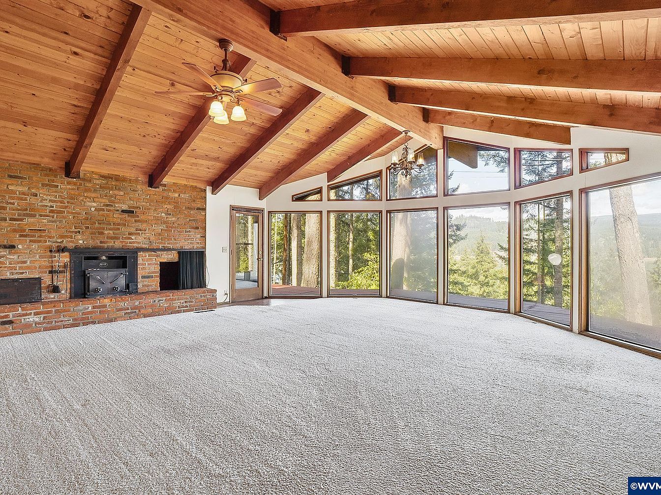 This spacious living room features a striking combination of natural materials and large windows that bring the outdoors in. The vaulted ceiling with exposed beams is clad in warm wood, complemented by a ceiling fan and an antique-style chandelier for layered lighting. A full brick wall anchors the space, showcasing a built-in wood stove fireplace for cozy ambiance. Floor-to-ceiling windows with unique geometric shapes offer panoramic views of surrounding trees and hills, flooding the room with natural light. The soft, light-colored carpet enhances comfort while balancing the rustic architectural details.