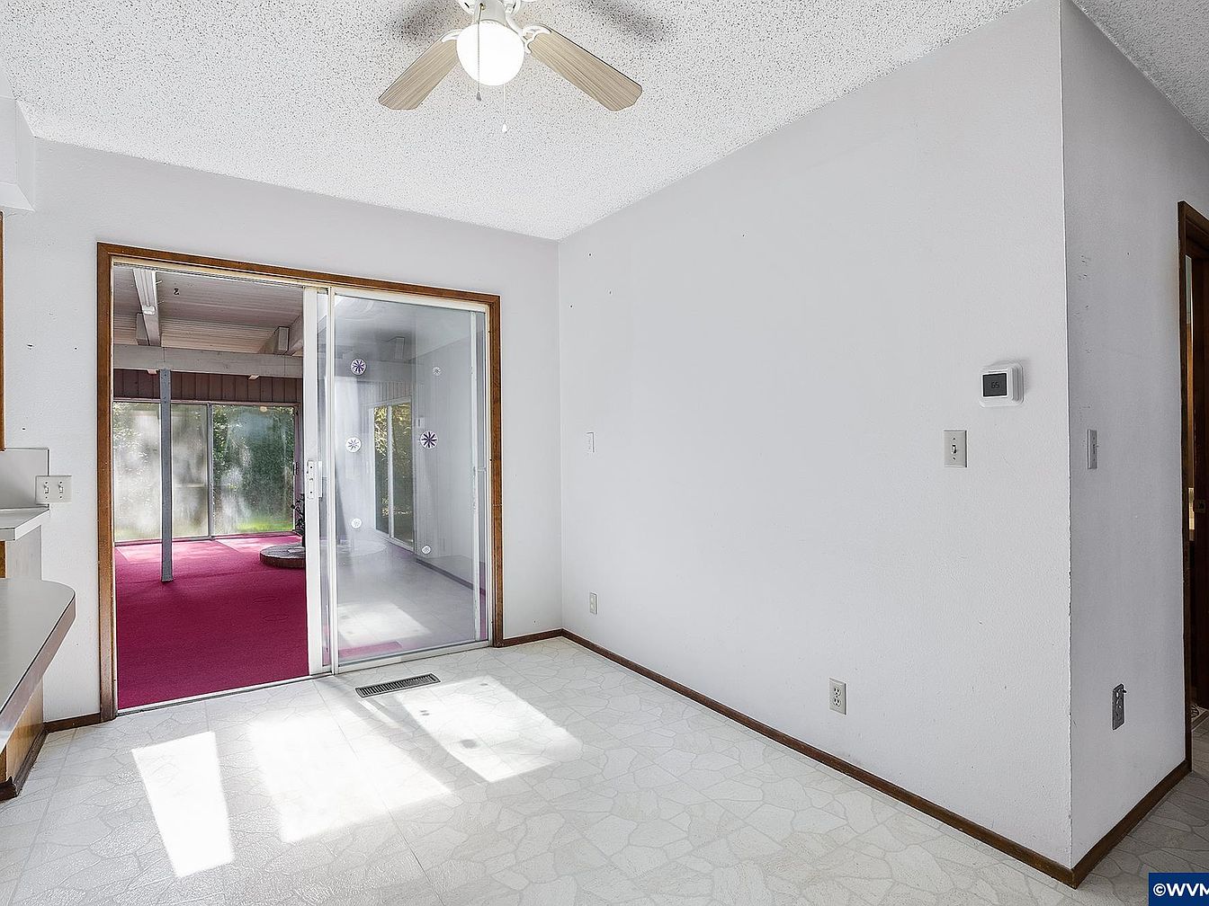 This cozy breakfast nook features a clean, minimalist design with white walls and a light-colored vinyl floor that mimics stone patterns. The space is illuminated by natural sunlight streaming through a large sliding glass door framed in varnished wood, offering a view into a sunroom or enclosed porch with striking red carpeting. A ceiling fan with wooden blades and a round light fixture hangs overhead, adding functionality and subtle charm. The room’s neutral color palette and uncluttered layout make it a versatile spot for casual dining or morning coffee, seamlessly connecting indoor and outdoor living areas.