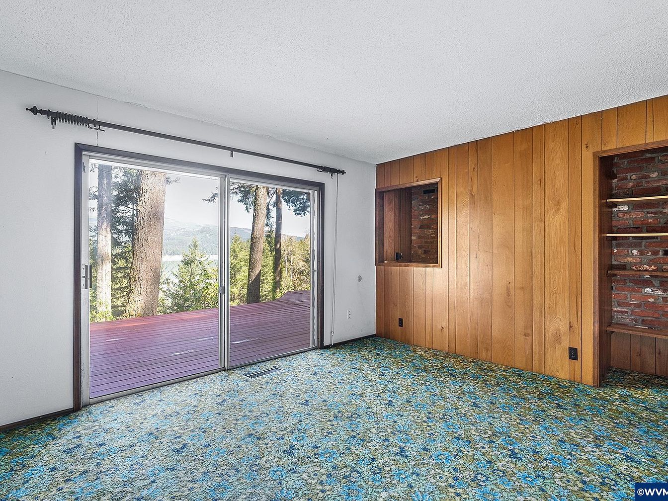 This living room features a large sliding glass door that opens directly onto a wooden deck, offering stunning views of lush trees and distant hills. The walls combine white paint with a wood-paneled accent wall, giving a retro yet cozy feel. A recessed nook with exposed brick adds architectural interest and a rustic touch, complemented by a built-in bookshelf. The carpet is vintage-style with a blend of blue, green, and beige floral patterns that add color and texture. Together, these elements create a room full of natural light and inviting character.