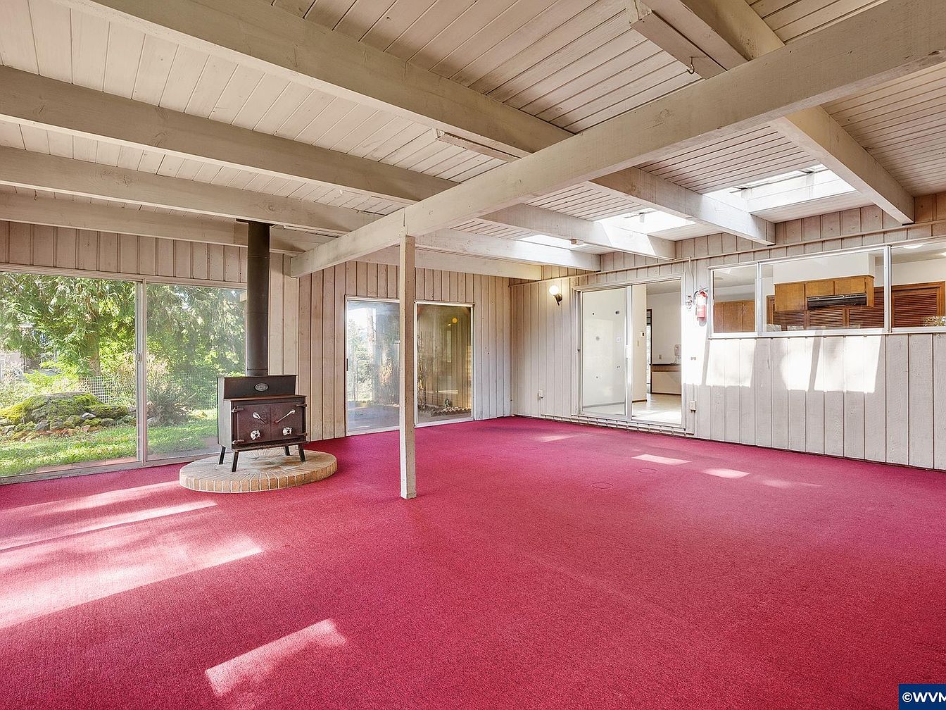 This spacious sunroom features a rustic yet bright design, anchored by a free-standing wood stove perched on a round brick hearth, perfect for cozy warmth. Natural light floods through large sliding glass doors that open to the garden, enhancing the airy ambiance. The ceiling consists of exposed wooden beams painted white, adding architectural interest and complementing the vertical wood paneling on the walls. The standout feature is the vivid red carpet that covers the floor, providing a bold contrast to the neutral tones and inviting a lively, energetic atmosphere. Skylights contribute additional sunlight, enhancing the open, inviting vibe of this versatile indoor-outdoor space.