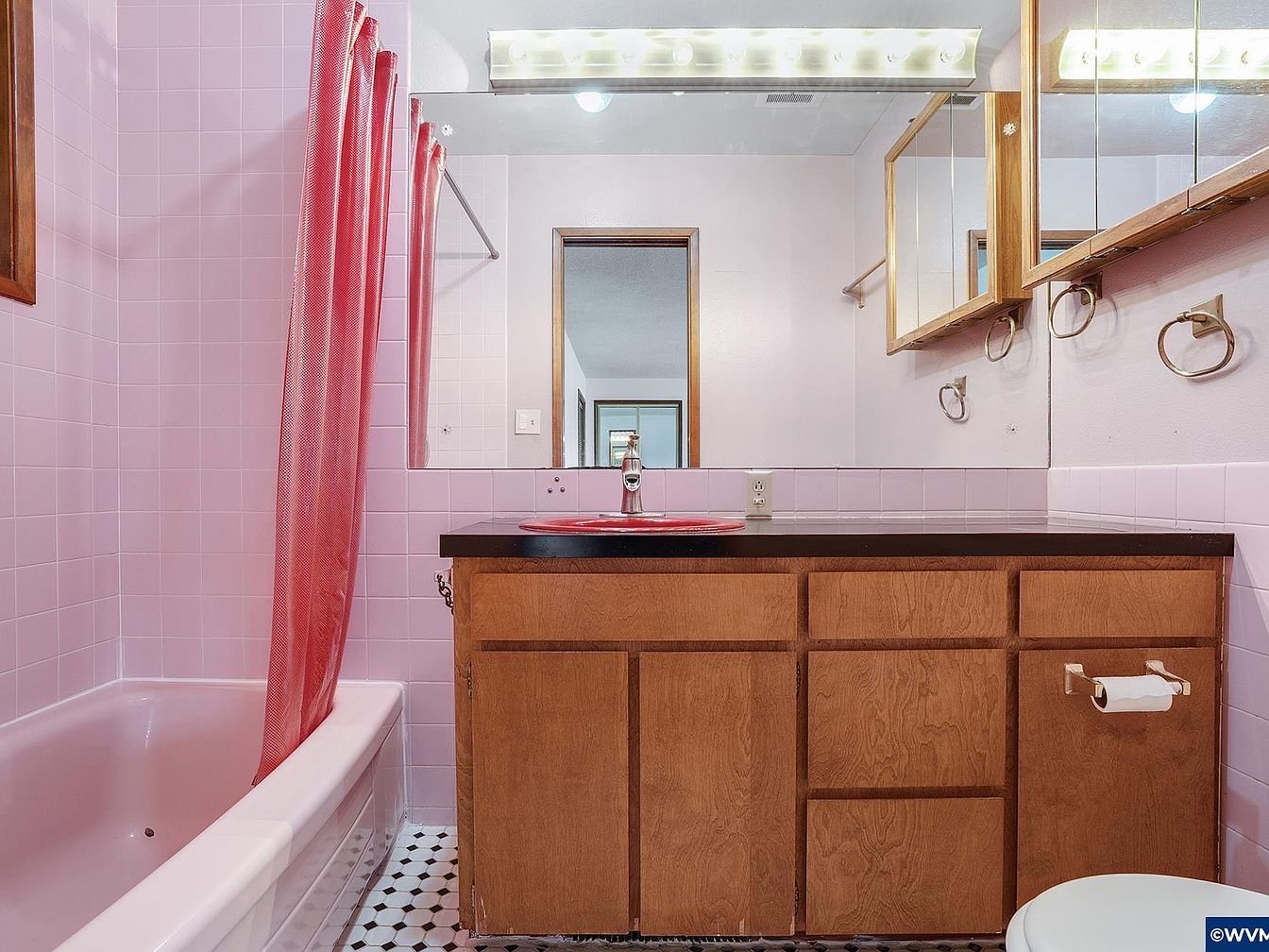 This bathroom features a warm wooden vanity with multiple cabinet doors beneath a dark countertop, complementing the soft pastel pink tile walls that extend halfway up. A matching pink bathtub and a similarly hued shower curtain add a retro charm to the space. The floor is tiled in a classic black and white hexagonal pattern, creating a subtle contrast to the pink tones. Above the vanity, a large frameless mirror spans the wall, reflecting the room’s layout, and a mirrored medicine cabinet with wooden trim adds extra functionality. Brass towel rings and a mounted light bar contribute to the room’s vintage aesthetic.
