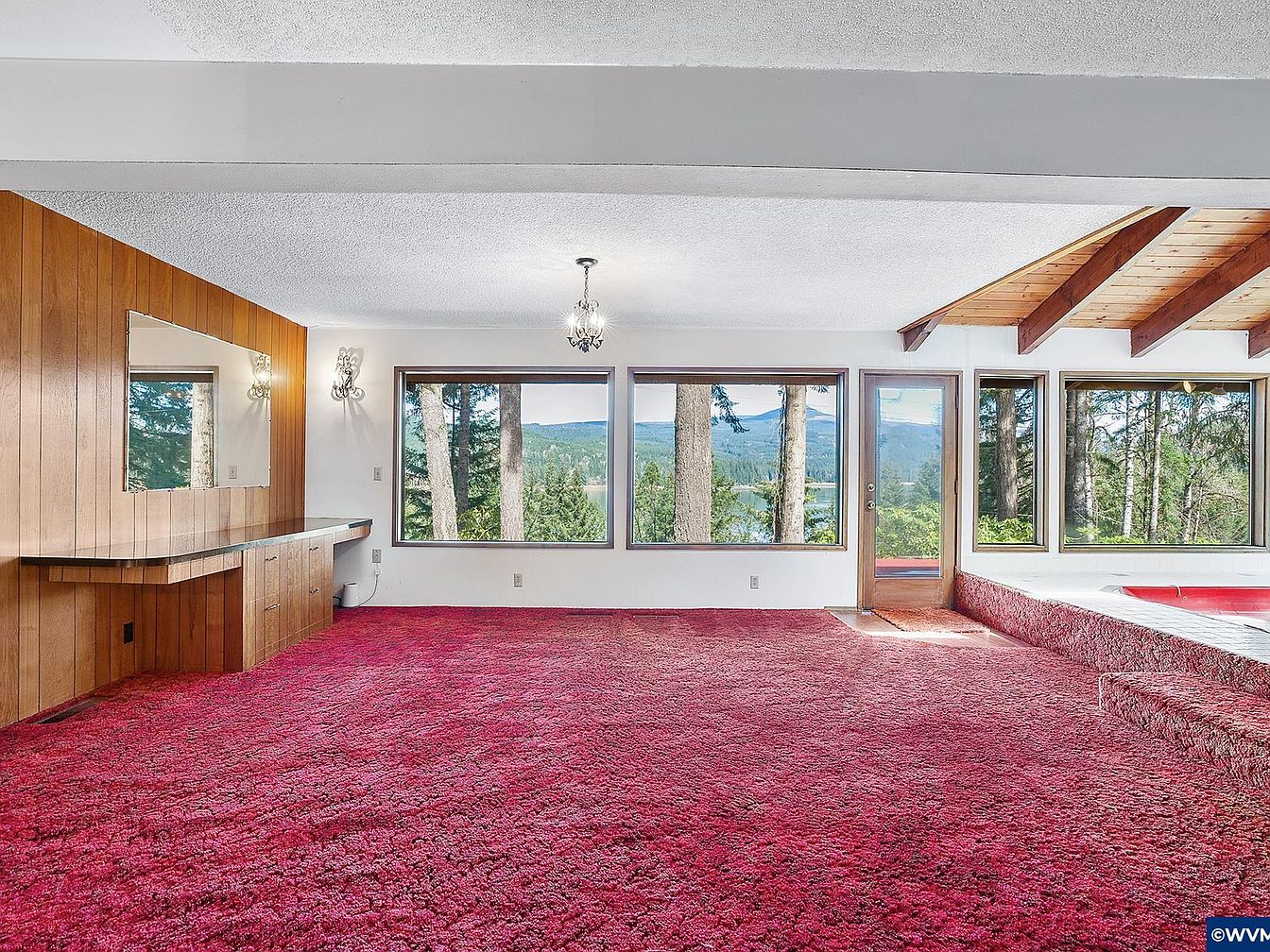 This spacious recreation room features a striking deep red plush carpet that extends throughout the floor, creating a bold, retro vibe. On one side, a built-in wooden cabinet with drawer storage and a long countertop area is set against a wood-paneled accent wall, complemented by a large rectangular mirror and vintage-style sconce lights. The opposite side reveals floor-to-ceiling windows and a glass door, framing a scenic forested landscape and lake views, inviting natural light. The ceiling transitions into wood paneling with exposed beams above a raised platform that likely holds a hot tub, blending rustic charm with mid-century character.