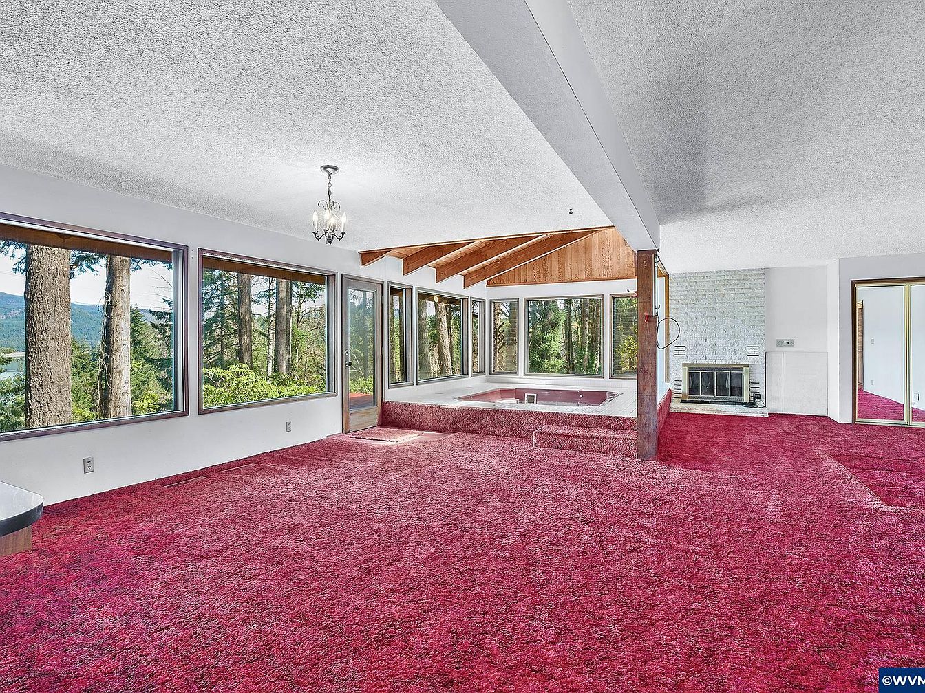 This spacious living room features expansive floor-to-ceiling windows on two walls, inviting abundant natural light and showcasing serene forest and mountain views. The walls are painted in a crisp white, contrasting with the deep magenta plush carpet that covers the entire floor, creating a retro yet cozy atmosphere. A unique sunken hot tub area is integrated into the corner of the room, surrounded by large windows and topped with an angled wooden ceiling and exposed beams, adding architectural interest. A white painted brick fireplace anchors the space, while a small chandelier provides soft overhead illumination. Sliding glass doors lead to adjacent rooms, completing the open and airy layout.