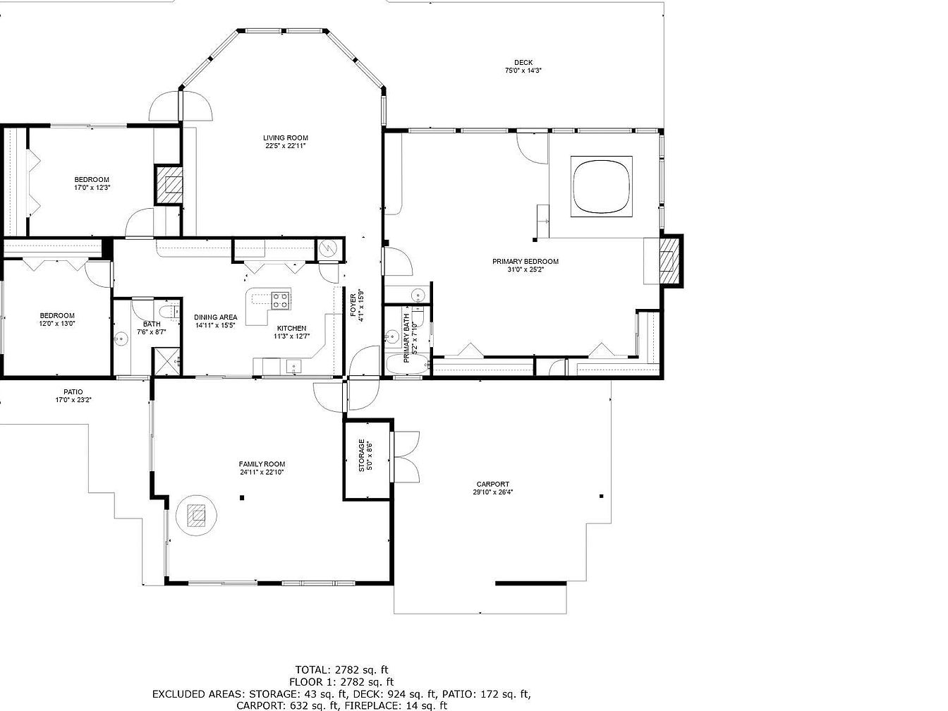 This spacious floor plan encompasses a welcoming foyer leading to multiple distinct areas. The home features a large family room with a fireplace, adjacent to a patio, ideal for entertaining. The living room is generously sized with a distinctive angled wall of windows, allowing natural light to fill the space. The kitchen and dining area create a functional hub near the center, optimized for workflow and accessibility. Three bedrooms include a primary suite with an attached bath and access to a deck, offering both privacy and outdoor enjoyment. Additional storage and a carport complete the layout, reflecting thoughtful design and practical living.