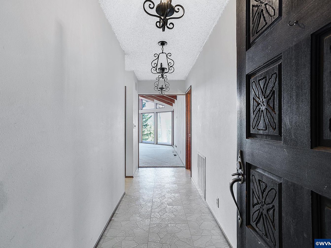 Stepping inside through the distinctive black front door featuring intricate carved patterns, the entry hallway extends long and narrow with light gray walls and a textured ceiling. The flooring consists of pale tiles with subtle geometric designs, leading the eye toward the bright living area beyond. Three wrought iron pendant lights hang in a row from the ceiling, adding an old-world charm to this transitional space. The hallway’s simplicity in color and decor highlights the architectural beams and large windows visible ahead, creating an inviting passage that connects to the heart of the home.