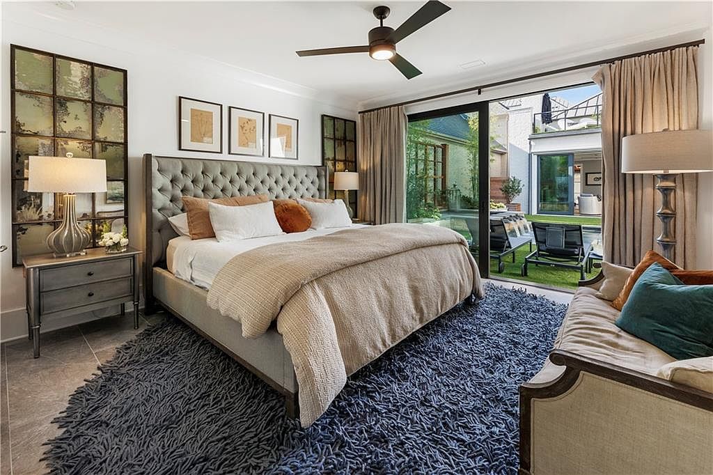 This master bedroom features a sophisticated and cozy design with a large upholstered bed framed by a tufted headboard that anchors the space. Neutral tones dominate, with beige bedding accented by soft white and warm rust-colored pillows, creating a calming yet inviting atmosphere. Flanking the bed, glass-front nightstands topped with elegant lamps provide balance and symmetry. Two large distressed metal panels add texture and character to the white walls, complementing the modern black ceiling fan overhead. A plush, deep blue shag rug softens the stone flooring, enhancing comfort underfoot. The open doorway leads to an adjoining room, seamlessly connecting the suite.