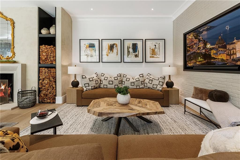 This inviting living room centers around a warm brown sofa adorned with patterned cushions that add a subtle geometric interest. A large, natural wood coffee table with a unique, angled design rests on a textured light gray rug, providing an organic touch. Flanking the sofa are two matching side tables each topped with a modern black-and-gold lamp. The room features soft lighting and neutral walls punctuated by abstract art in black frames above the sofa, introducing gold and blue accents. A whitewashed brick wall serves as a backdrop to a large, vibrant cityscape artwork, while a cozy fireplace with neatly stacked logs adds warmth and rustic charm.