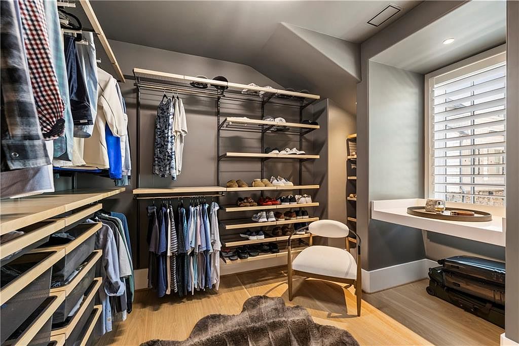 This well-organized walk-in closet features an efficient layout with open shelving and hanging rods on three walls, maximizing storage space for clothing and accessories. A sleek white island with a decorative ceramic vase sits in the center, accompanied by a comfortable upholstered chair, providing a spot for dressing or folding clothes. The neutral gray walls create a calming backdrop, complemented by light wood flooring that adds warmth and texture. Modern round pendant lights overhead illuminate the space evenly. A framed wall art piece adds a subtle artistic touch, enhancing the closet’s stylish and functional ambiance.