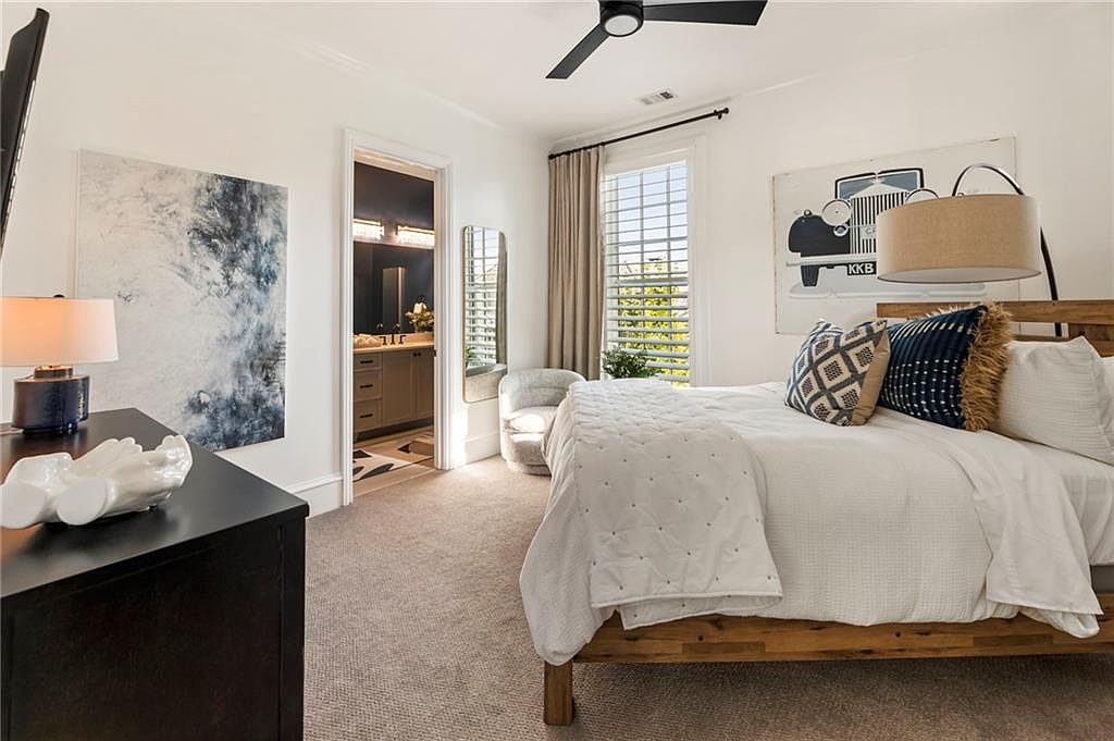 This serene bedroom corner features a warm wooden bed frame adorned with crisp white bedding accented by an assortment of textured pillows in navy, beige, and geometric patterns. The neutral walls create a bright backdrop, enhanced by natural light streaming through plantation shutters on the large window, framed with simple beige curtains. A modern black ceiling fan adds a sleek contrast to the soft palette. A cozy light grey armchair nestles near the window, while a black dresser displays an artistic ceramic piece and a contemporary lamp. Wall art with abstract and classic car motifs adds personality and character to the space, while a full-length mirror near the doorway enhances the room’s openness. The adjoining bathroom is visible through an open door, boasting dark cabinetry and warm lighting, complementing the bedroom’s inviting atmosphere.