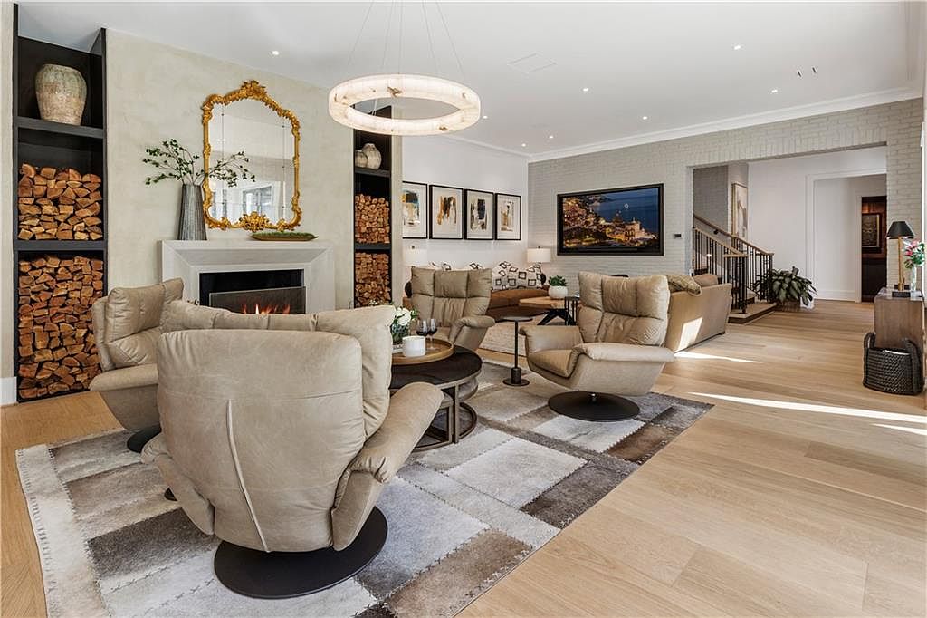 This spacious living room features a warm, inviting layout centered around a modern fireplace with a beige surround and an ornate gold-framed mirror above it. Flanking the fireplace are built-in black shelving units stocked with neatly stacked firewood and decorative vases, adding rustic charm. Four plush, light brown swivel armchairs circle a trio of nested round coffee tables on a patchwork area rug in earthy tones. The color palette combines beige, cream, and soft browns with natural wood flooring and exposed brick walls. Contemporary art and a large TV integrate seamlessly. A sleek circular chandelier and recessed ceiling lights provide ambient lighting. The open floor plan connects this cozy seating nook to a wider living space with stairs and additional decor visible in the background, emphasizing comfort and style.
