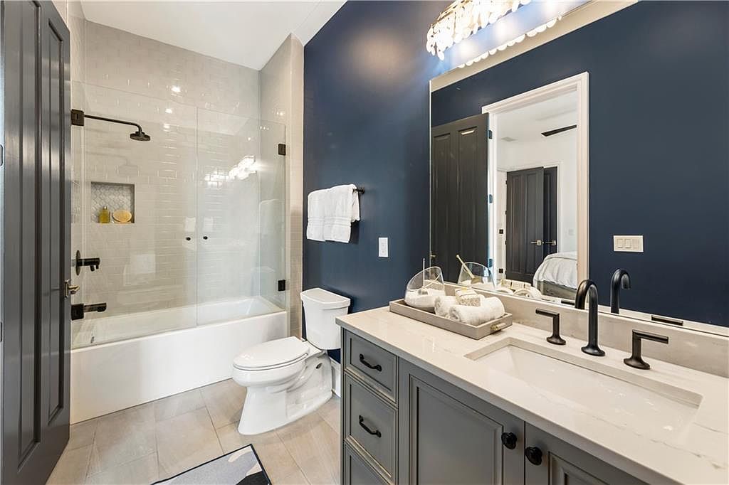 This bathroom features a sleek and functional layout with a bathtub and shower enclosure framed by clear glass doors, highlighting glossy white subway tiles in the bathing area. The walls are painted in a bold navy blue, creating a striking contrast with the lighter tones of the floor tiles and white tub. The vanity is charcoal gray with a white quartz countertop, complemented by matte black fixtures for a modern touch. A large rectangular mirror spans the length of the sink, centered under a decorative light fixture that adds elegance. Thoughtful storage and a neatly arranged towel holder complete this sophisticated space.