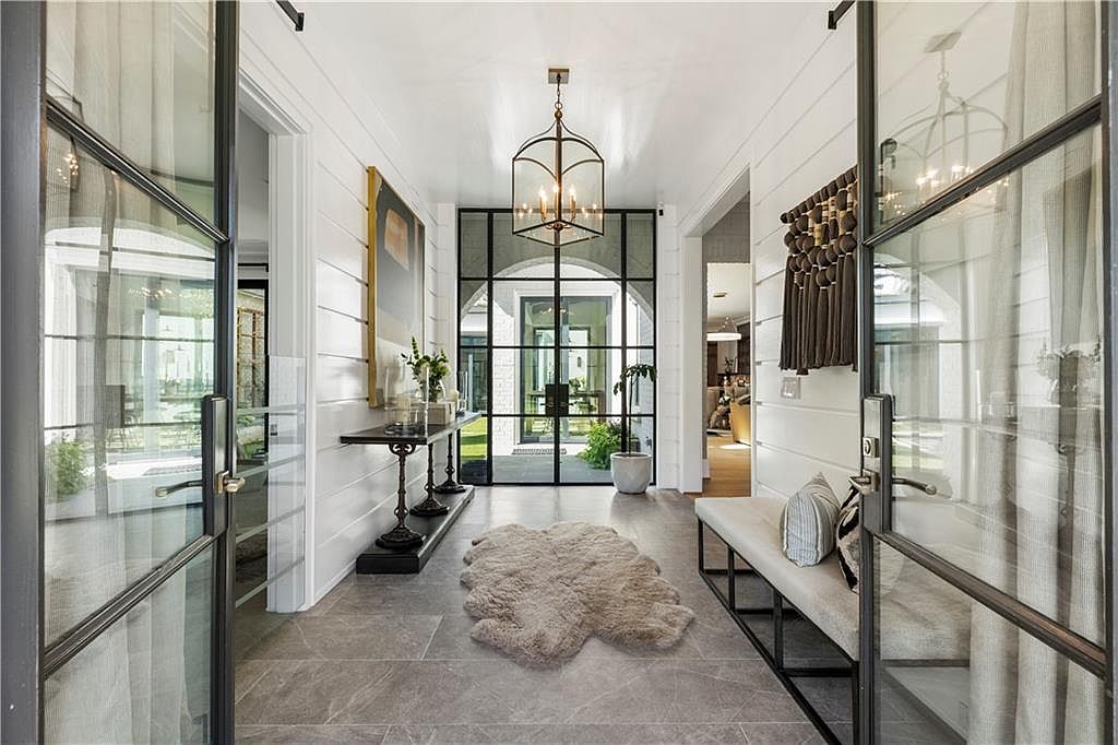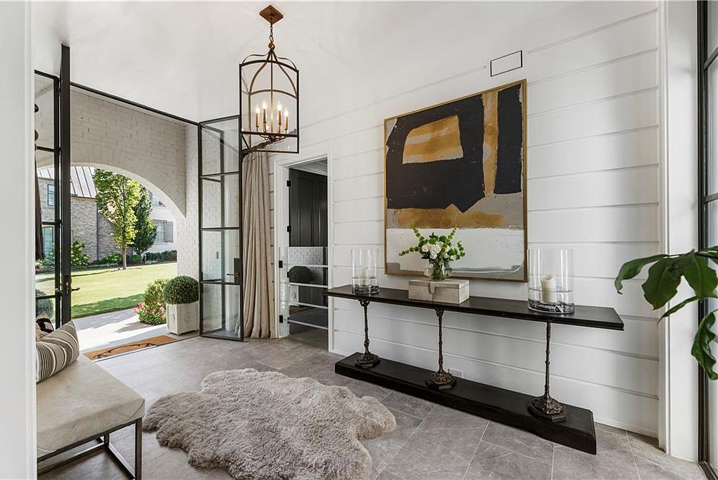 This entryway welcomes with a mix of modern and classic aesthetics. The space is brightened by large black-framed glass doors that open to a lush front yard, allowing natural light to flood in. The walls are adorned with white horizontal shiplap, creating texture and a clean look. A sleek, dark wood console table with ornate iron legs runs along one side, topped with glass candle holders, a small floral arrangement, and a stylish abstract painting in neutral tones of black, beige, and white. A plush, light-colored sheepskin rug softens the large gray tiled floor, while a simple cushioned bench with a striped pillow sits by the doorway, adding warmth and practicality. A geometric iron chandelier hangs from the white ceiling, tying the room’s sophisticated yet inviting atmosphere together.