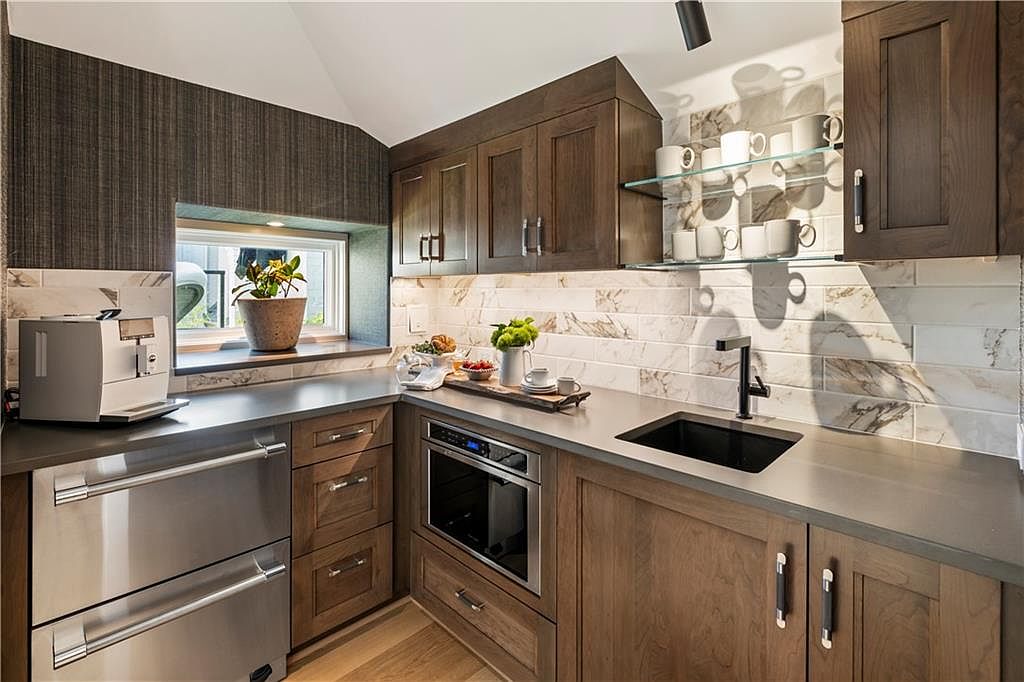 This compact kitchen nook blends functionality with a warm, earthy aesthetic. Rich, medium-toned wood cabinetry lines both the upper and lower sections, featuring simple, modern hardware that complements the sleek gray countertops. A small, rectangular window brings natural light, illuminating the space and highlighting a potted plant on the windowsill. The backsplash is adorned with elegant marble-look tiles, creating subtle texture and sophistication. Stainless steel appliances, including a built-in microwave and drawer-style dishwasher, maximize space efficiency. Floating glass shelves with stacked white mugs add a contemporary flair, while a matte black faucet over a minimalist black sink completes the refined yet practical design.