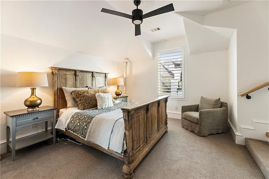 This inviting bedroom features a classic wooden bed frame with carved details, complementing the soft earth-toned carpet that covers the floor. The bed is dressed with layered blankets and plush pillows in neutral and muted tones, bringing warmth and texture. Flanking the bed are two bedside tables in a muted gray shade, each topped with elegant brass lamps that add a cozy golden glow. A comfortable armchair sits in a corner by a window with white plantation shutters, offering a quiet reading space. The white walls and ceiling with architectural angles contribute to an airy, peaceful ambiance, enhanced by a sleek black ceiling fan for temperature control. Steps with a wooden handrail lead to an adjacent area, adding subtle architectural interest.
