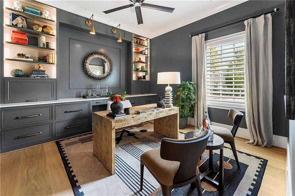 This sophisticated home office features a striking charcoal gray palette on the walls and built-in cabinetry, lending a modern and moody atmosphere. The room is anchored by a natural wood desk with clean, simple lines, positioned on an earth-toned geometric rug that adds warmth and texture. Symmetrical built-in shelves with soft backlighting highlight an array of decorative objects and books, bringing personality and depth to the space. A circular sunburst mirror serves as a focal point on the wall, while light beige curtains and a large window with white plantation shutters balance the darker tones with bright, natural light. Two mid-century modern chairs with a small side table complete the inviting sitting area, complemented by a sculptural white table lamp and leafy plant for added softness and contrast. Natural hardwood floors and a sleek black ceiling fan finish the look with understated elegance.