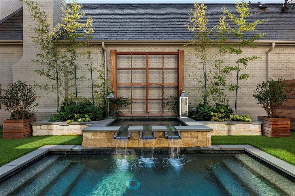 This serene backyard water feature is designed with a contemporary aesthetic, blending natural elements and clean lines. The focal point is a tiered waterfall flowing gracefully into a rectangular pool, framed by smooth stone coping. The backdrop features a white-painted brick wall with a wooden lattice window, adding texture and warmth. Flanking the water elements are planting beds bordered with light stone, containing bamboo and leafy greenery for vertical interest. Two large, modern lanterns sit symmetrically on the ledge, enhancing the tranquil ambiance. Dark roofing shingles and rich wood planter boxes complete this elegant outdoor retreat.