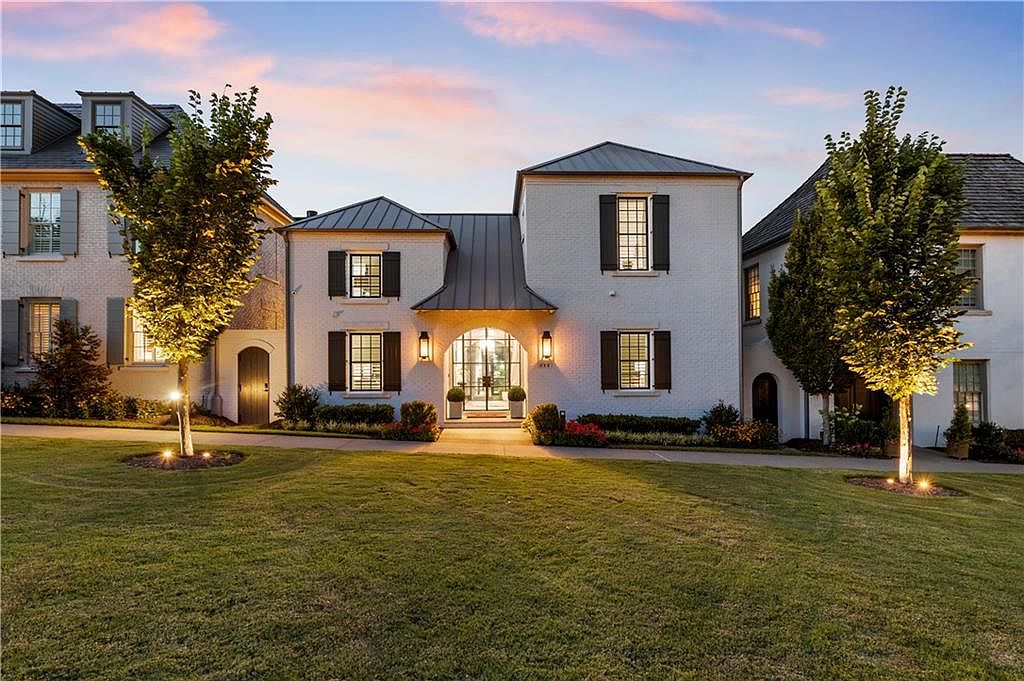 This stately home features a symmetrical façade painted in crisp white brick with contrasting black shutters framing the windows. The roof’s sleek metal material adds a contemporary touch to the classic architecture. A grand arched front entryway, softly illuminated by warm wall sconces, invites guests inside. The front yard is spacious with a manicured lawn, accentuated by two well-lit, evenly spaced trees on either side of the main walkway. The landscaping is tasteful and understated, with small shrubs and flower beds lining the house’s foundation, creating a polished and welcoming curb appeal at dusk.