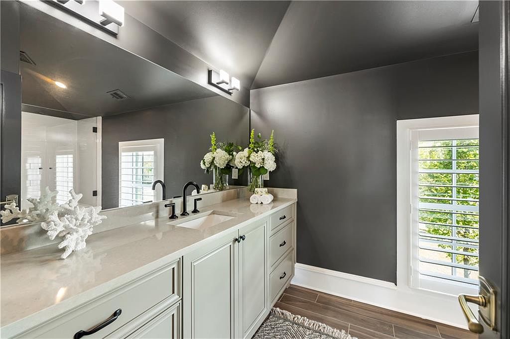This bathroom features a sleek, modern vanity area with a muted gray wall that contrasts elegantly against the light cabinetry. The long countertop is finished with a smooth, light-toned surface that houses two minimalist black faucets and a single integrated sink. A large mirror spans the wall above the vanity, reflecting natural light from a window fitted with white plantation shutters. Wood-look tile flooring adds warmth and texture, complemented by a soft, patterned rug. Decorative elements include fresh white flowers in clear glass vases and a sculptural white coral ornament, enhancing the space’s refined, coastal-inspired aesthetic.