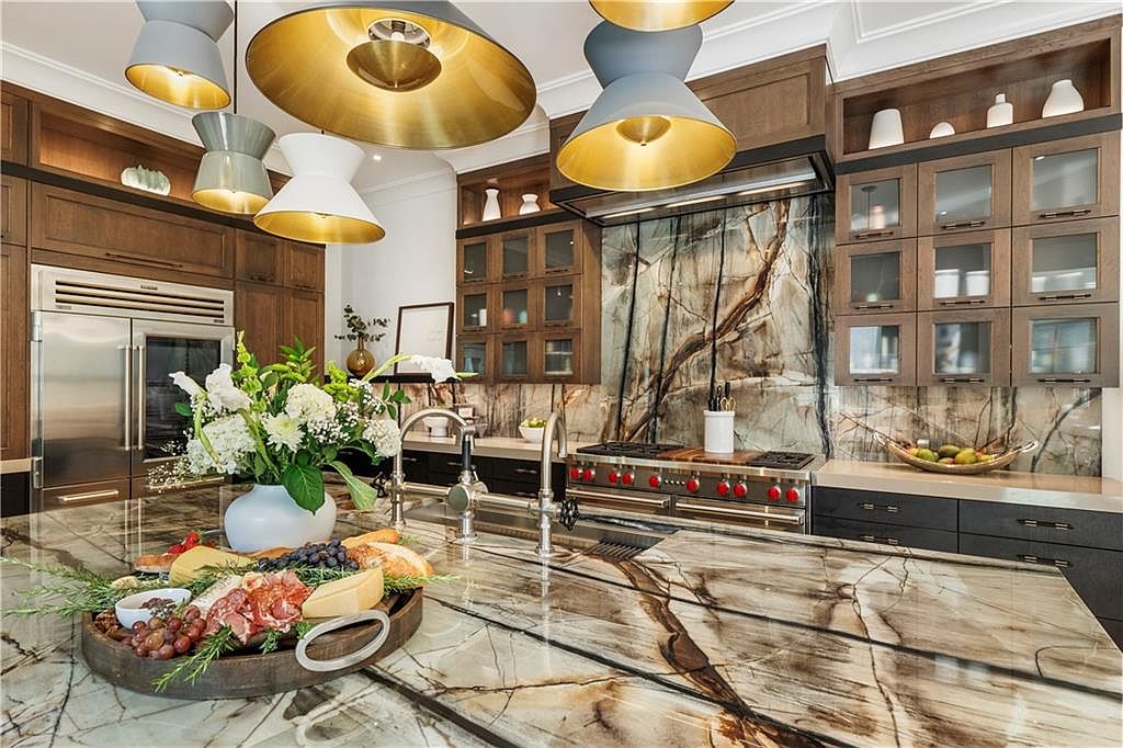 This kitchen features a grand island with a striking polished natural stone countertop showcasing rich veining in browns, creams, and grays. The island includes a built-in sink and space for prep work, elegantly adorned with a fresh floral arrangement and a charcuterie platter. Above, bold pendant lights with matte exteriors and gold interiors cast a warm glow, enhancing the luxurious ambiance. The cabinetry is a harmonious mix of medium and dark wood tones, including glass-front upper cabinets displaying minimalist white dishware. The backsplash and range hood area boast the same stone material as the island, unifying the space with natural, organic patterns. Stainless steel appliances, including a professional-grade stove with vivid red knobs, anchor the room with modern sophistication.