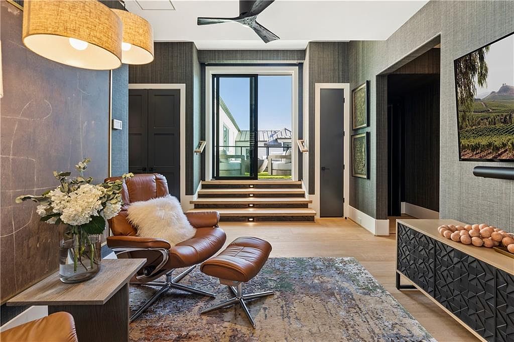 This inviting sitting area centers around a sleek mid-century modern leather lounge chair and matching ottoman, positioned on a muted, earth-toned area rug. The walls are covered in textured gray wallpaper, adding depth and a sophisticated backdrop to the space. A contemporary ceiling fan and large pendant light above provide modern flair and functionality. The focal point at the end of the room is a set of steps with inset lights leading to sliding glass doors that open to an outdoor terrace, allowing natural light to pour in. Decorative elements include a wooden console with geometric detailing and a vase of fresh flowers, enhancing the warm, stylish ambiance.