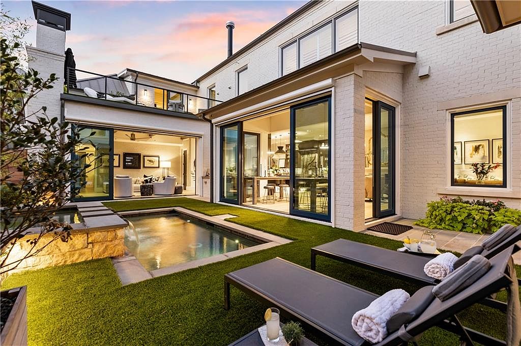 This backyard retreat features a contemporary pool surrounded by neatly trimmed artificial grass, creating a clean and low-maintenance outdoor space. The pool is bordered by light stone tiles with a small cascading water feature adding a soothing element. Floor-to-ceiling sliding glass doors open wide from the house to seamlessly blend indoor and outdoor living. The exterior walls are painted crisp white brick, enhancing the bright, airy ambiance. Two modern black-framed chaise lounges with folded white towels invite relaxation. Lush potted plants add a touch of greenery, balancing the sleek, minimalist design with natural warmth.