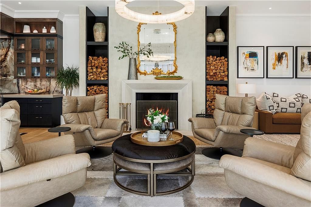 This cozy living room centers around a modern fireplace framed by a soft, light stone mantel. Shelves flanking the fireplace are filled with neatly stacked firewood and decorative pottery, adding rustic warmth to the room. Four plush, taupe leather recliners form an inviting conversation circle around a large, round ottoman that doubles as a coffee table, topped with a wooden tray holding elegant glassware and a floral arrangement. Behind, a sectional sofa in muted earth tones complements abstract expressionist art on the wall. The room’s palette blends beige, cream, and warm woods, enhanced by soft natural light and a contemporary chandelier above.
