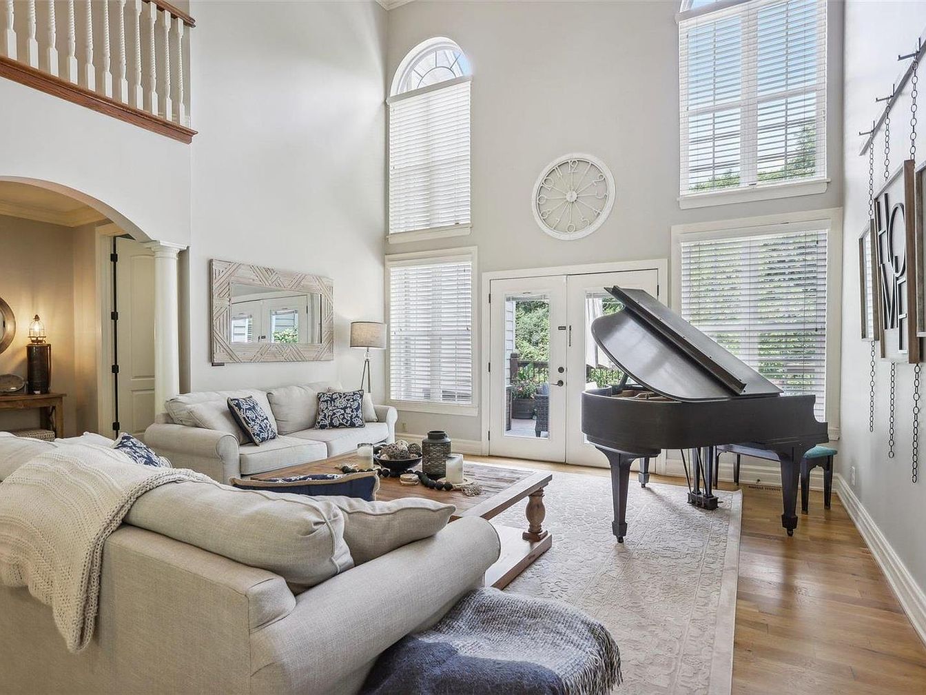 This spacious living room features an airy, open layout marked by soaring ceilings and multiple large windows that fill the area with natural light. Soft neutral tones of cream and beige dominate the color scheme, creating a calm and inviting atmosphere. Two plush sofas with blue and white accent pillows surround a solid wood coffee table set atop a pale, textured rug. A sleek black grand piano adds sophistication and a touch of artistic charm. Architectural details include a second-floor balcony with a classic white balustrade, an arched doorway, and elegant crown molding enhancing the room’s refined style. Decorative touches such as a large mirror, a standing lamp, and wall art spelling “HOME” contribute warmth and personality.