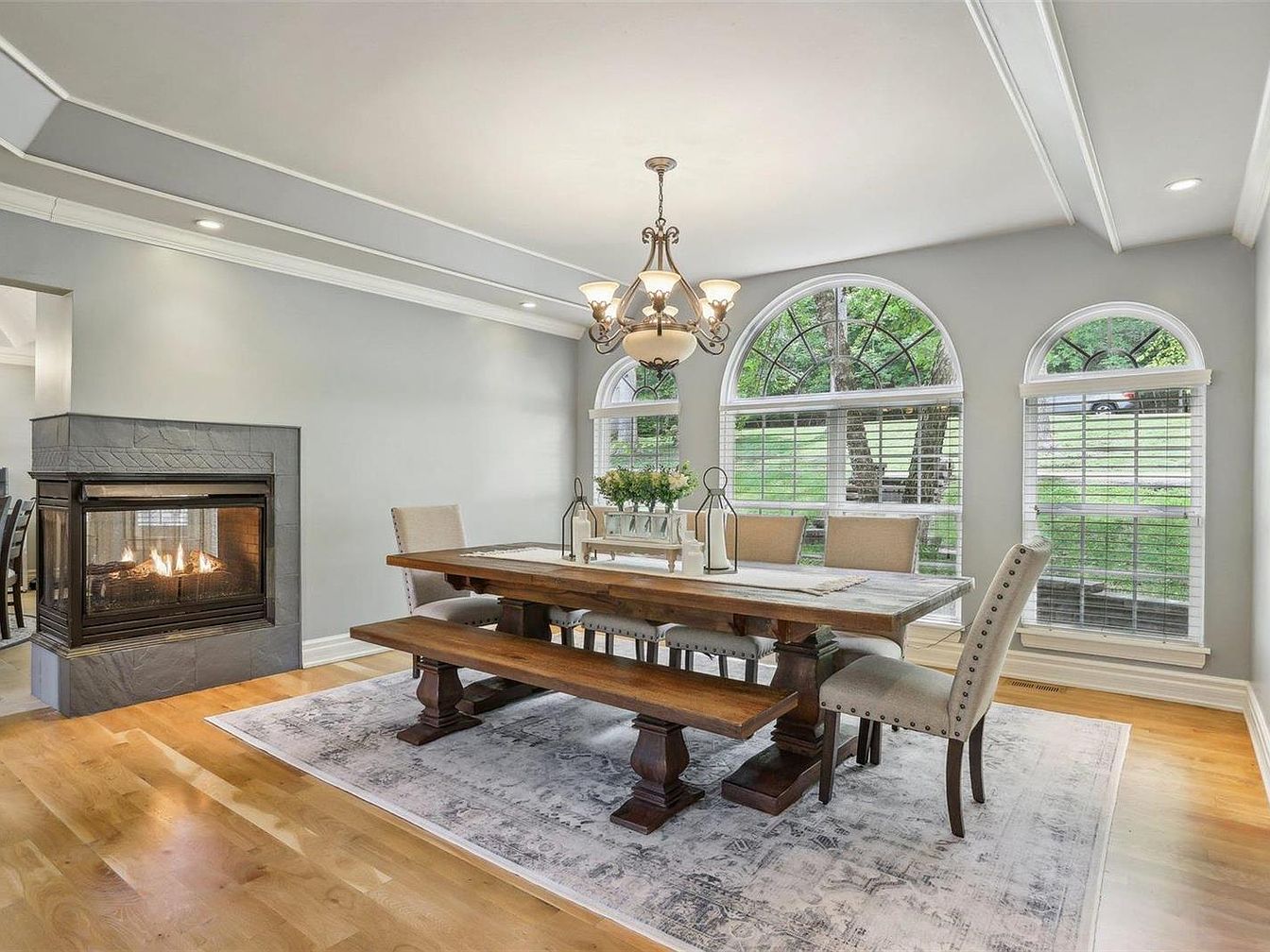 This elegant dining room features a warm, inviting atmosphere with large arched windows that flood the space with natural light and offer a serene view of the lush greenery outside. The wooden dining table is rustic yet polished, complemented by a matching bench and upholstered chairs with nailhead trim that add a touch of sophistication. Muted gray walls create a calm backdrop, contrasting beautifully with the honey-toned hardwood floors. The room is anchored by a softly patterned area rug. A classic chandelier hangs overhead, and a cozy double-sided fireplace provides warmth and ambiance, seamlessly connecting this room to an adjacent living space for a harmonious flow.