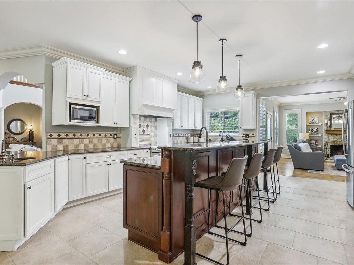 This spacious kitchen features an elegant central island with rich dark wood cabinetry contrasted by sleek granite countertops. The island is lined with four modern bar stools in muted brown leather upholstery, offering a casual dining or gathering space. Pendant lights with clear glass shades hang overhead, casting soft, inviting illumination. Surrounding the island, white cabinetry and cream beige tile floors create a bright and airy atmosphere. A decorative tiled backsplash with diamond accents adds subtle texture. The open concept layout flows seamlessly into an adjacent living room with a stone fireplace and large windows, growing a warm and welcoming environment.