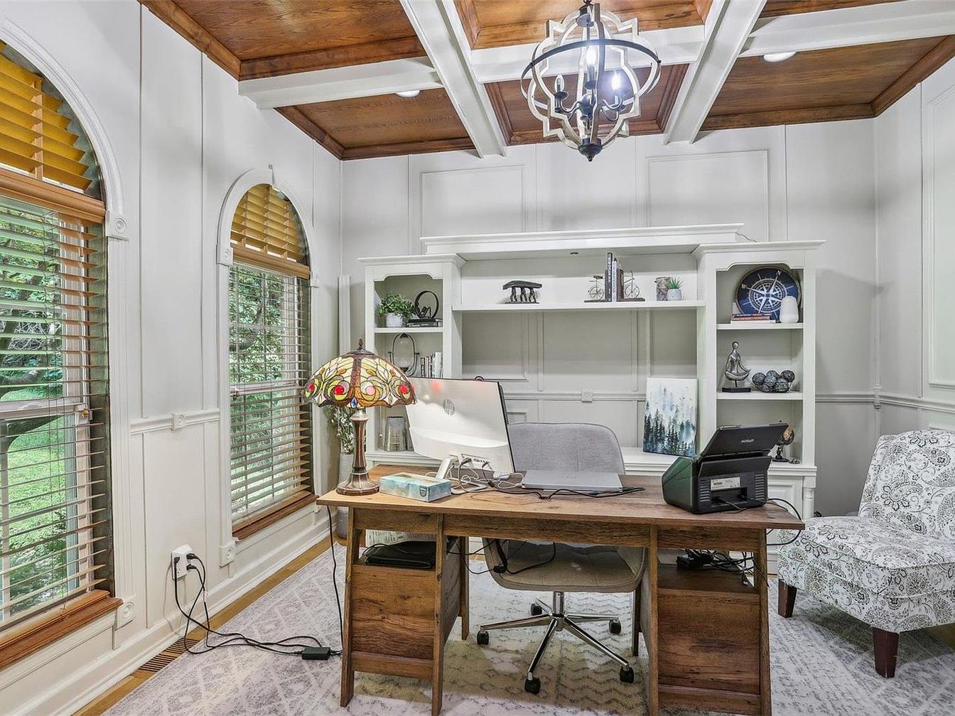 This cozy home office features warm wood accents contrasted with crisp white walls and molding, creating a bright yet inviting atmosphere. The ceiling is accented with rich wood panels interspersed with white beams, highlighting a decorative chandelier that adds character to the space. Two large, arched windows with wooden blinds allow ample natural light to flood the room while framing views of greenery outside. The wooden desk, complemented by a modern office chair, sits centrally with a stained-glass table lamp adding a touch of vintage charm. Built-in shelving units hold decorative items and books, combining functionality with aesthetic appeal. A patterned upholstered chair offers additional seating, all resting on a light, patterned area rug that softens the hardwood floor.