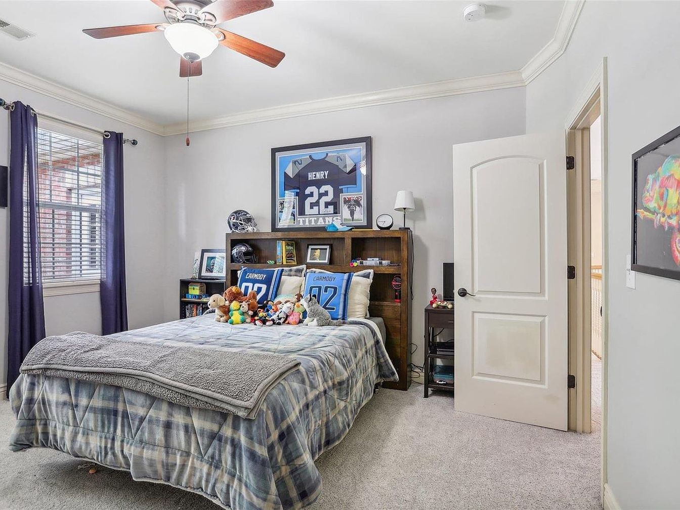 This bedroom features a calming palette of soft grays and blues, with light gray walls enhancing the natural daylight streaming through a window dressed in dark blue curtains. A queen-sized bed in the center wears a plaid comforter layered with a cozy gray throw blanket, and is adorned with youthful stuffed animals and sports-themed pillows, reflecting personal charm. A rustic wood headboard doubles as bookshelf storage, topped with framed sports memorabilia and helmets, adding character and warmth. The classic white door with black hardware, light gray carpeting, and ceiling fan with wooden blades complete this inviting and personalized space.