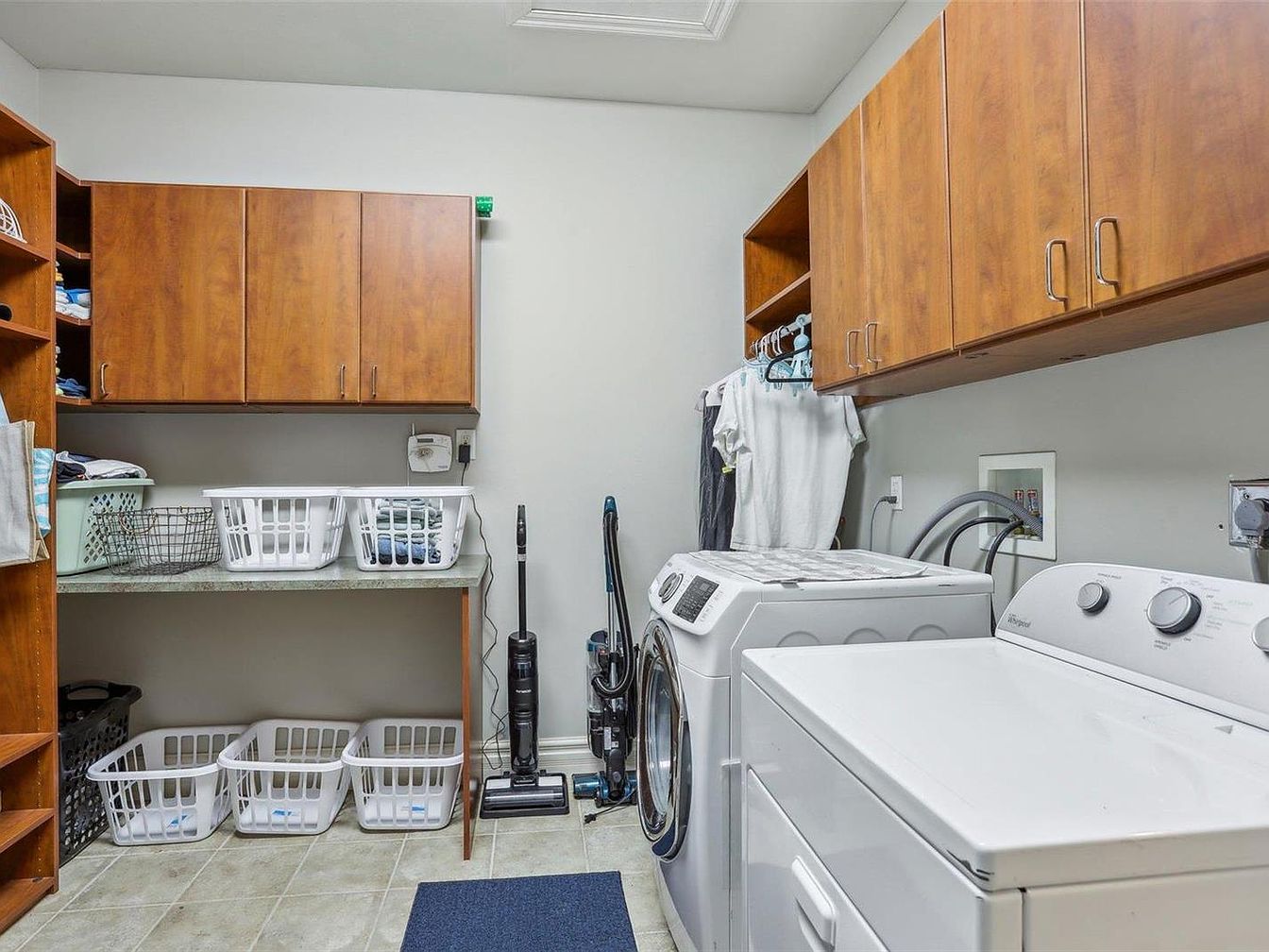 This laundry room features practical organization with a neutral, light gray wall color that complements the warm wood tones of the ample cabinetry. Two large, white appliances—a front-loading washer and top-loading dryer—sit side by side beneath a set of floating wooden cabinets, providing hidden storage space. Along the adjacent wall, open shelving units and a countertop hold several white laundry baskets for sorting clothes. The tiled floor is a light beige, blending seamlessly with the overall muted color palette. Several vacuum cleaners stand neatly against the wall, emphasizing the room’s multi-purpose storage function. The space is designed for efficiency while maintaining a clean and orderly aesthetic.