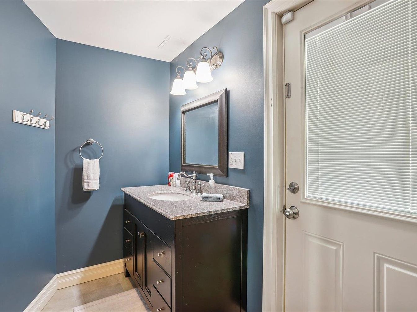 This bathroom space features a sleek vanity with a dark wood cabinet base topped with a polished granite countertop in subtle gray tones. An undermount sink is complemented by brushed nickel fixtures. The walls are painted a calming, deep blue shade, creating a serene contrast with the white baseboards and the white door that includes frosted glass blinds for privacy and natural light. Above the vanity, a rectangular mirror with a thick dark frame is illuminated by a classic three-light wall fixture with frosted shades. The floor is tiled in neutral beige, harmonizing the overall color palette. A metallic towel ring holds a white hand towel, and a row of five metallic hooks on the adjacent wall adds functional charm to this cozy, well-organized bathroom area.