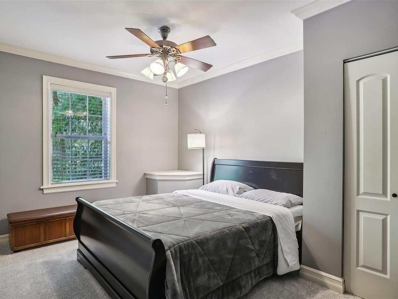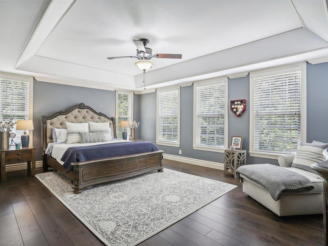 This spacious master bedroom features a serene color palette of soft gray walls paired with white trim and crown molding, complementing the dark hardwood floors. A large, tufted wooden bed with intricate detailing anchors the room, flanked by matching wooden nightstands with stylish lamps providing warm ambient lighting. Multiple tall windows with white blinds let in ample natural light, brightening the space. A comfortable chaise lounge with a textured throw adds a cozy seating area. An elegant light-gray patterned area rug defines the sleeping zone, while a ceiling fan with light completes the blend of comfort and classic style.