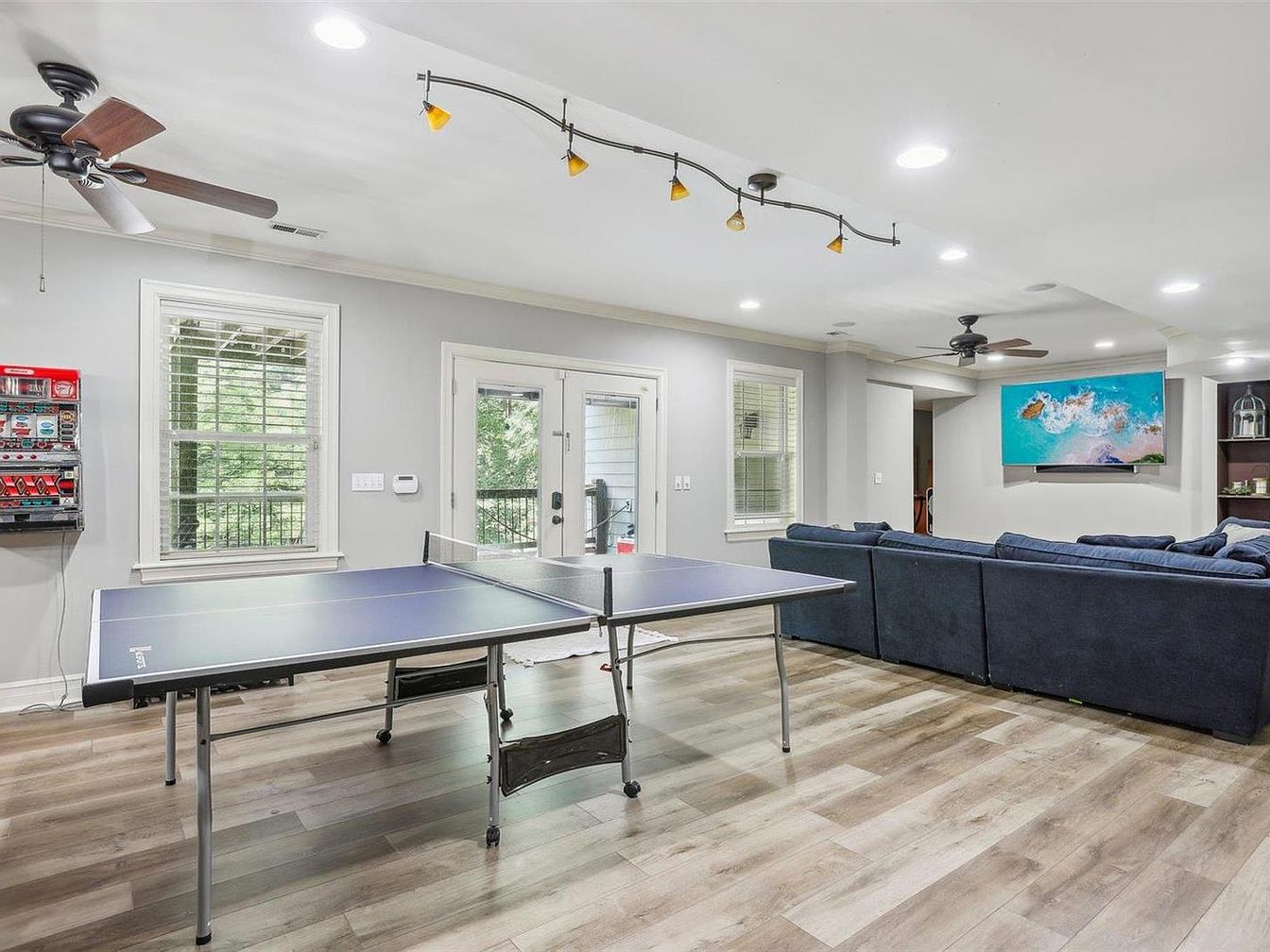 This spacious game room features a central ping-pong table with a sleek design and foldable legs, seamlessly integrating recreation into the living space. The flooring is a light-toned wood laminate, adding warmth and a contemporary feel. To the right, a large, dark blue sectional sofa offers ample seating facing a wall-mounted flat-screen television displaying a vivid ocean scene, perfect for relaxation and entertainment. Natural light filters through white-framed windows and French doors leading to an outdoor area. The ceiling incorporates dual dark wood ceiling fans and a curving track light with yellow-tinted fixtures, enhancing illumination and style.