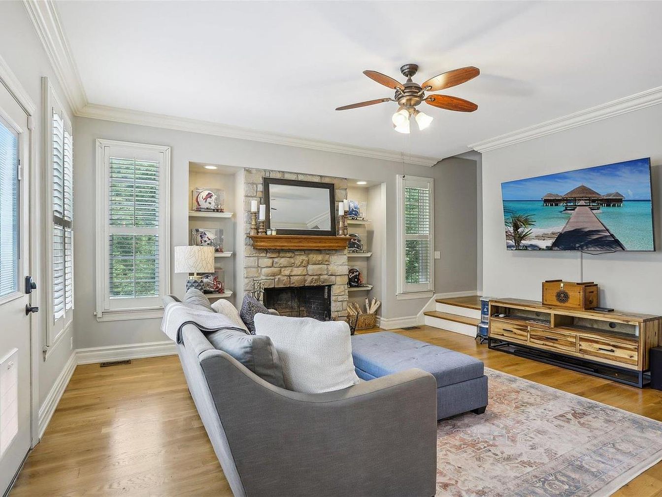 This inviting family room features a calming neutral palette of soft grays and whites complemented by warm wood tones in the flooring and furniture. A large gray sectional sofa with plush cushions anchors the room, facing a stone fireplace flanked by built-in white shelves showcasing decorative items. Above the mantel, a framed mirror adds depth. Natural light streams through tall windows with white shutters, enhancing the airy atmosphere. A wooden media console beneath a wall-mounted TV blends rustic charm with modern function, while a ceiling fan with wooden blades provides comfort and style. The overall design balances comfort with understated elegance.