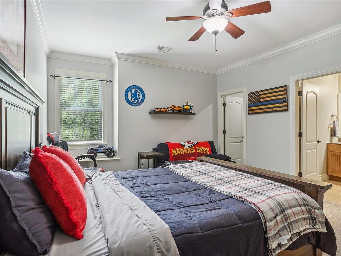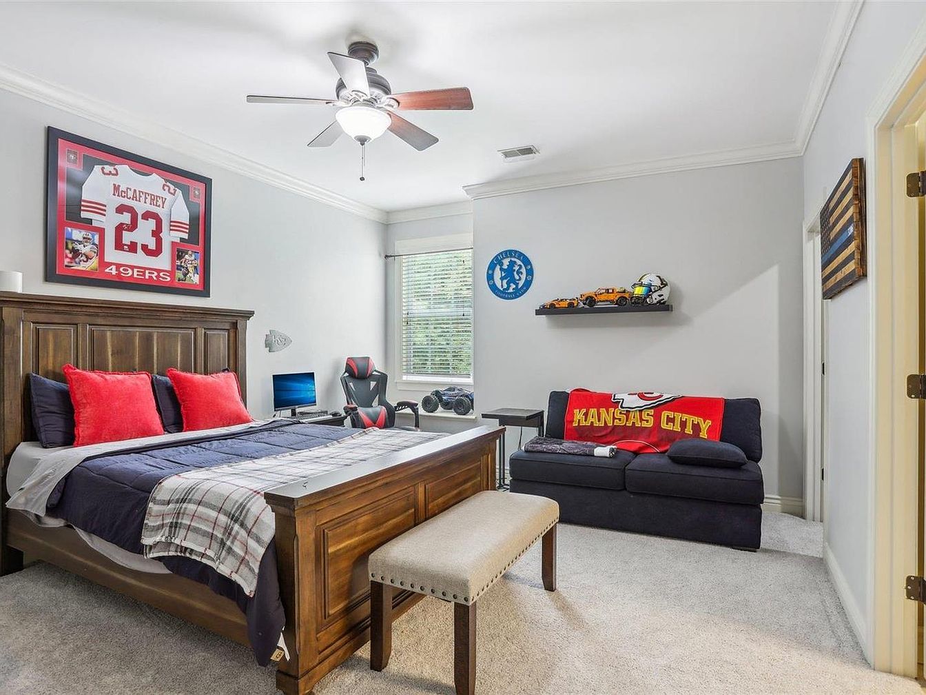 This bedroom combines comfort with personalized sporty flair. A large wooden bed with a headboard anchors the room, dressed in dark blue bedding accented by bright red pillows and a plaid throw. The wall above the bed is decorated with a framed sports jersey, adding a personal touch. Adjacent to the bed, a small desk with a computer chair sits by the window, inviting a quiet workspace. A cozy black couch against the opposite wall is draped with a bold “Kansas City” throw, complemented by a floating shelf displaying model cars and memorabilia. Neutral walls and beige carpeting maintain a calm atmosphere amid energetic accents.