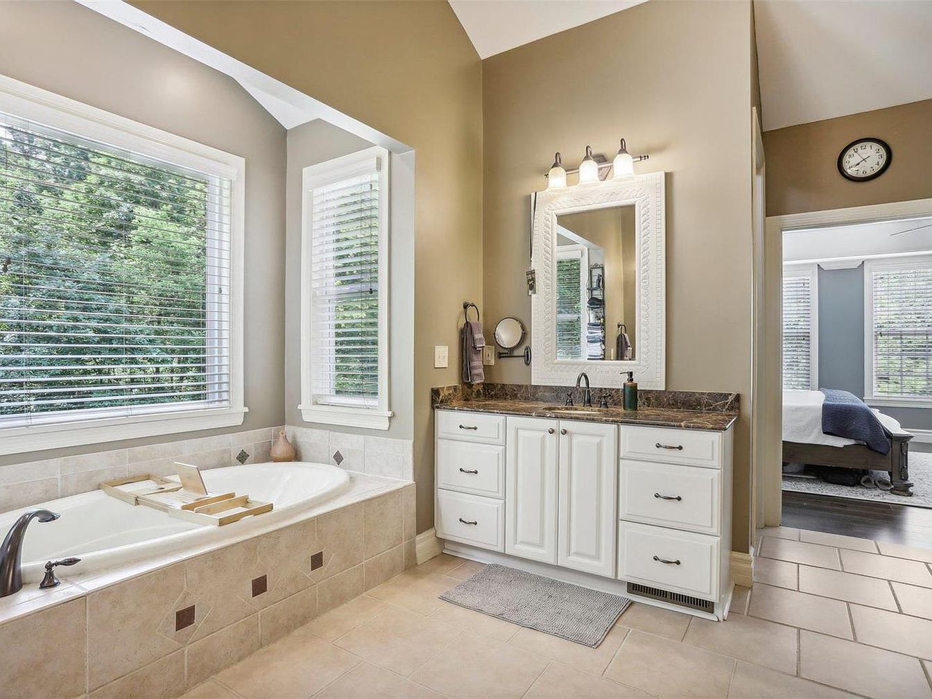 This master bathroom combines comfort and style with a large bathtub encased in beige tiles featuring decorative darker square accents. Two adjacent windows with white blinds invite ample natural light and lush greenery views, enhancing a tranquil atmosphere. The white vanity cabinet with multiple drawers offers practical storage, topped with a dark marbled countertop that contrasts with the neutral color palette. Above the sink, a framed white mirror is illuminated by a classic three-light fixture. The beige tiled floor extends throughout, smoothly connecting the bathroom to the adjacent bedroom through an open doorway.